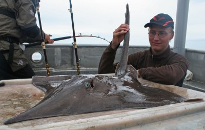Kim får etterhvert også kontakt med fisk og driller snart på stor fisk (selvom den “virka lætt” på kveitfeskarn fra det kalde nord). En livlig hannskate på 9,2 kg og 119 cm viste seg snart. Dessverre sto jeg og drilla samtidig og fikk ikke tatt bilde. Jeg hadde nemlig mitt andre skaterun og det var tyngre enn forrige gang… Med nervene i helspenn og syrefast biceps fikk jeg trua den opp til overflata der den viste seg å være en mindre feilkroka spisskate. Kroken satt 10 cm utenfor munnen. Litt nedtur, men endelig godt den ikke var større enn den forrige! Vi veide den raskt til 8,8 kg og slapp den uti igjen. Under oppsummeringa kom vi altså til 5 landa spisskater, fordelt på 4 av 5 deltagere. Ingemar var dessverre litt uheldig og mista stor fiske en stykke over bunn.