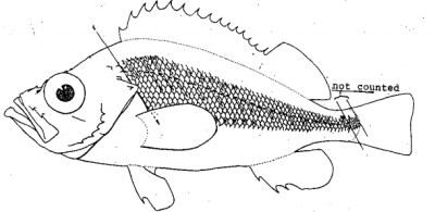 Her er det to begreper ute å går, eller i grunn tre. Der det i FNAM står “lateral line scales” menes det i realiteten “lateral line pores”, noe som ikke er sjekket på denne fisken. Ellers har vi antall sidelinjeskjell, som er et etterhvert ganske rettfrem begrep i artsfiskemiljløet. Dernest har vi antall skjellrekker. Sistnevnte blir brukt endel, og under følger en illustrasjon på hvordan de telles: