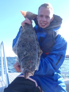 Turen fortsetter med 2 skater til på meg, men det vil ikke løsne for Kenneth. Men etter en stund så får Kenneth endelig kontakt igjen, og fast fisk! Denne oppfører seg ikke som en piggskate, og jeg (kveiteekspert som jakte på den usannsynlige kilosgrenså på kveit) anslår det til kveite fra første stund. Og opp kommer det faktisk et frimerke(eller monster tatt min kveitesamling i betraktning)! Knallkule bifangst, og ny art på Kenneth!