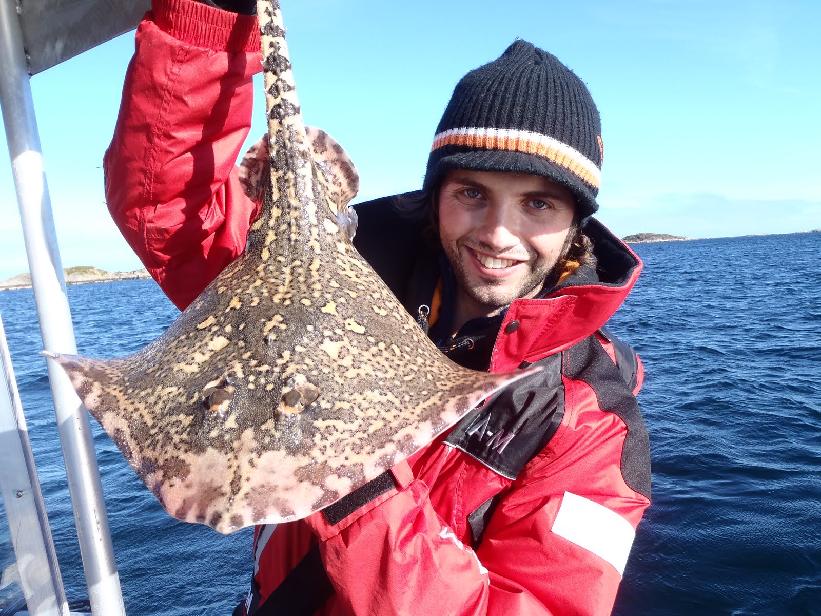 Var uheldigvis meldt mye vind utaskjærs både lørdag og søndag, så vi la oss i le innaskjærs, hvor piggskate ble hovedmålet for turen. Det starter knall, og første halvtimen gir meg 2 skater, og Kenneth har kontakt. Dessverre er det et svakt punkt på lina hans, og snøret ryker…