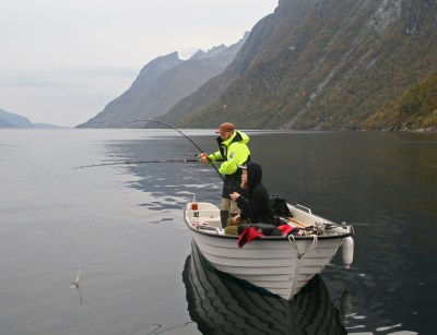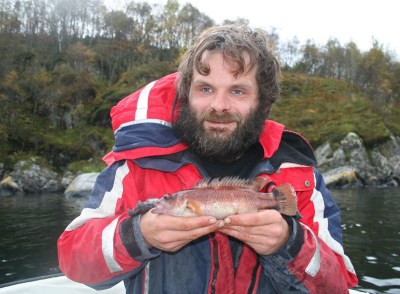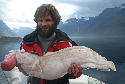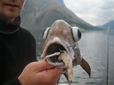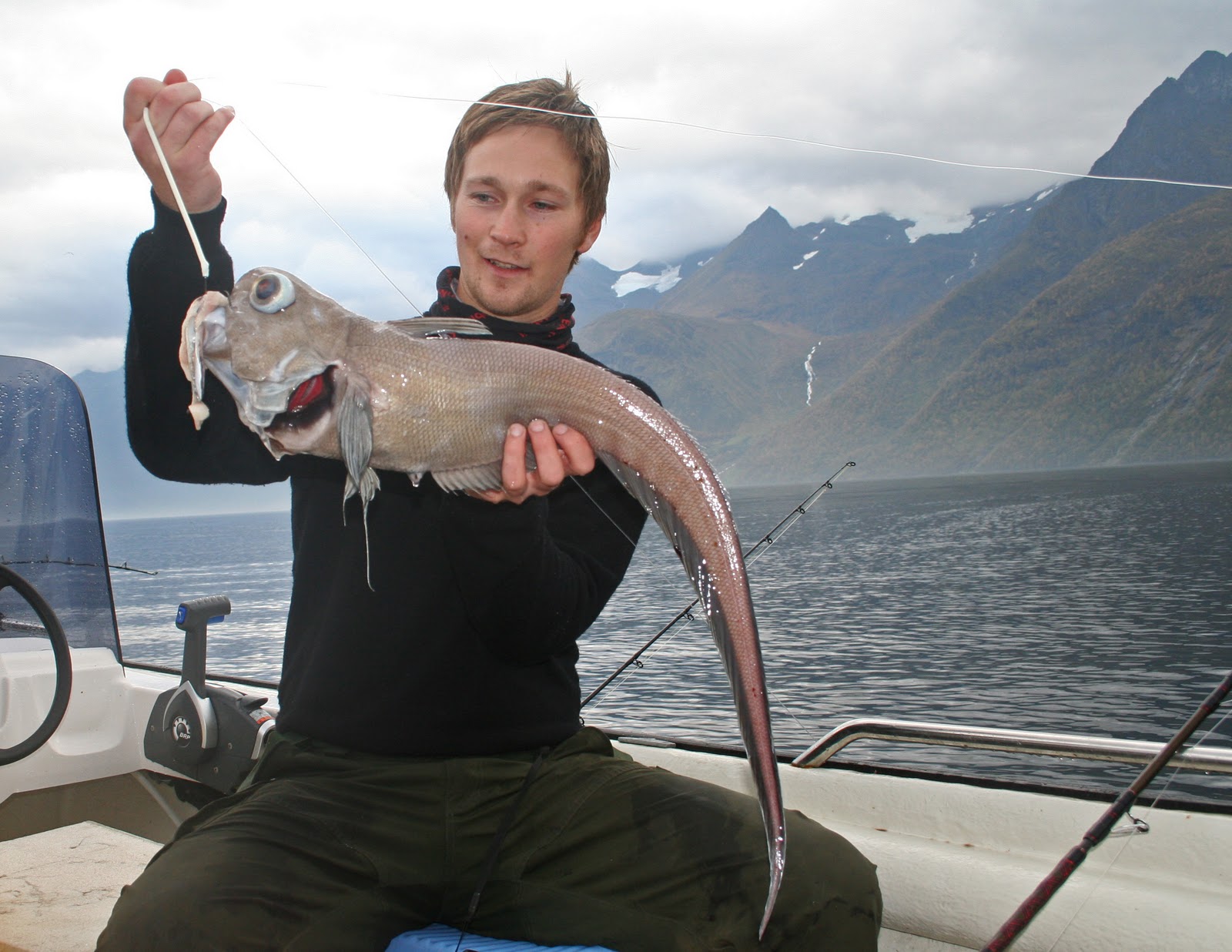 Natten ble til dag – en virkelig flott sådan, fjorden lå speilblank og gradestokken viste 17 grader allerede kl. halv 9. En drøy time seinere satt vi forventningsfulle i båten på vei ut på fjorden. Båten var en 18 fots Øien med 25 hk, brei og med mye plass til utstyr. Etter noen slipp på grunna etter random fisk uten annet enn en bærepose med pir (små makrell) stakk vi ut på dypet. Vi var nødt til å benytte det fine været til å fiske dypt, må vite! Med blålange og spisskate i tankene taklet vi med slep og opphenger(e) agnet med fersk og gammel makrell. Et kvarters tid etter ankomst fjordbunnen, 410 meter under båten, blir takkelet dradd nedover. Det er tydelig at noe napper på opphengern min, og jeg gir den 10 sekunder før jeg sveiver sirkelkroken på fisken. Jeg tenker ikke noe mer over det under oppsveivinga, for gudvethvormange hågjel og småbrosmer jeg har fått på dypet. Da topshot’en var inne og fisken kom til syne datt imidlertid geipen til knærne. Skolest! 5/0-kroken sitter perfekt og jeg kan tomle den over ripa til pinlig jubling! Vekta viser 1550 gram, og spekimenfisk! Vi er jo tross alt på spekimentur!