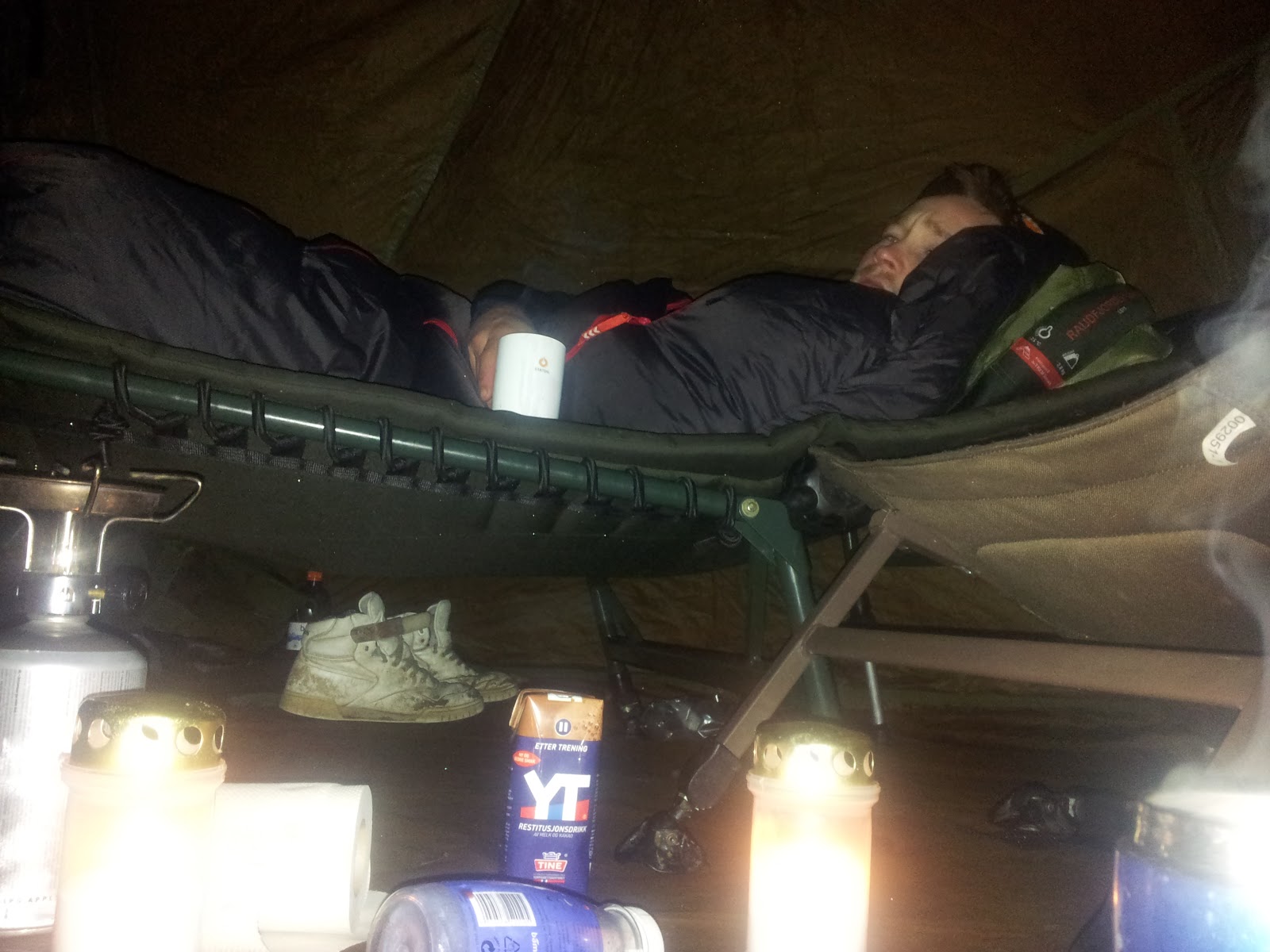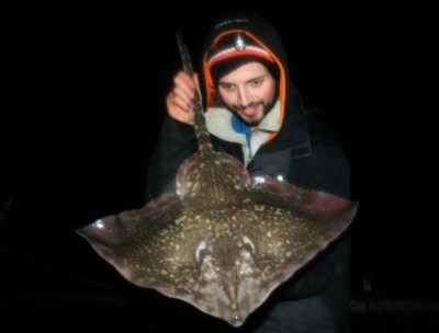 Vi tok 18.45-båten tilbake til Namsos, og etter en dobbel bacon-cheese m/alt på Shell starta vi på gårsdagens pigghåkai. Pigghåen var borte, men det var all annen fisk også. Så etter to timer flytta vi oss tilbake på hjemmebane og fikk sitte i ly av teltet. Inni teltet så det uforskammet ryddig ut, på tross av at lokalbefolkningen (les: Vilhelm) hadde observert ilsk oter på vei ut, litt tidligere på dagen. Anders Ahamm kom en tur innom for å slå av en prat med de gale bymusene, og fikk bevitne den første av kveldens tre skater. Alle skatene kom i løpet av en times tid og fra det samme hølet som kvelden før. Det spesielle var at i kveld var det bare hannskater som hadde tatt over symøte-spoten til fordel for pokerlag. Men etter at vi hadde krøpet ned i soveposene i 2-tida, runna det hissig på Bjørns siste stang som hadde stått ute i en time uten agnbytte. Ut i undertøyet og igang med pumping av skate. Det dumme var at jeg også måtte ut av soveposen siden håvingen er en tomannsjobb. Skata var en litt småamper hunnskate som satt en effektiv stopper for pølsefesten i hølet.