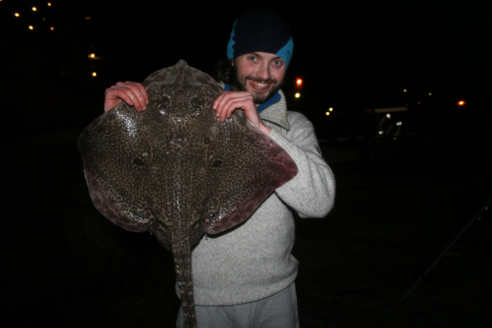 Jeg hadde fortrengt at det tidvis kan være mye pigghå i systemet, så etter en time og 15 pigghå på den første kaia flytta vi oss snart nærmere sentrum. Her slo vi opp dome’n og gjorde klar for nattas skatejakt. Pigghåen var lykkelig fraværende, og bortsett fra et par gylne hågjel fikk agna ligge i ro. Lokalbefolkningen, i form av Vilhelm, kom også innom med bart, stalltips og colasnus. I løpet av en drøy time seint på kvelden fikk vi opp 5 skater, fra nøyaktig samme posisjon, og alle hunnskater. Akkurat som om de hadde symøte der nede mellom klokken elleve og halv ett. Største dama veides til 6,42 kg og var ny pers fra land.