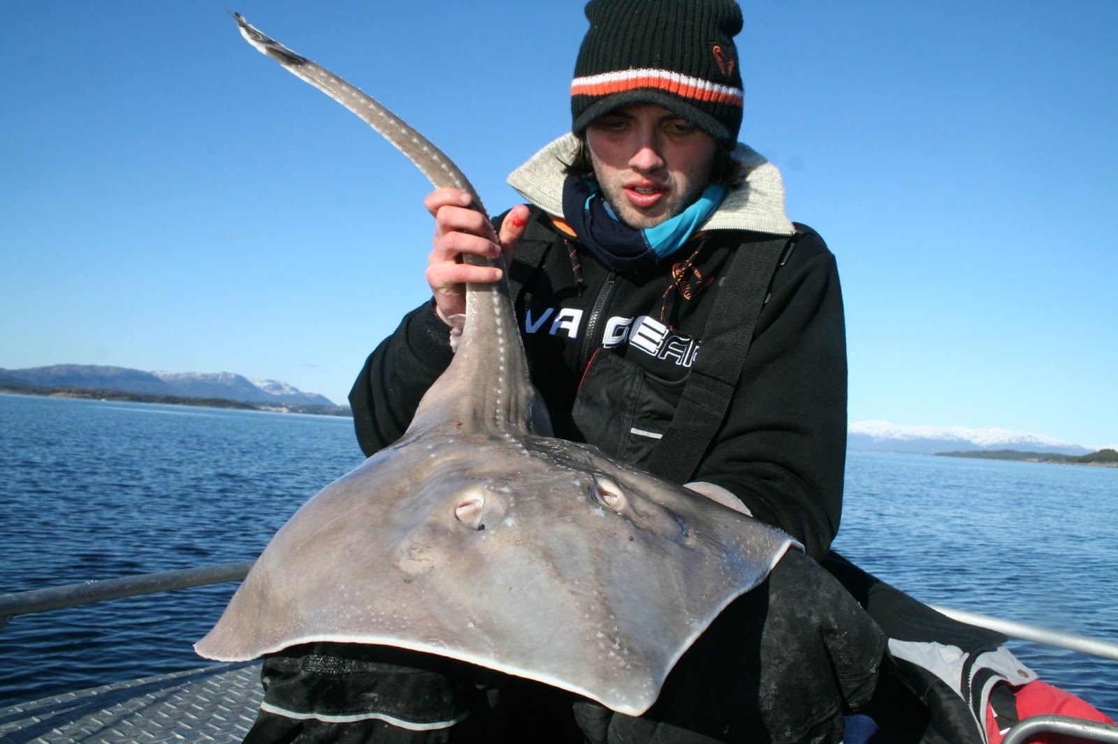 Bursdagen min ble feira med en 13 timers lang biltur 22.mars, men festen skulle vise seg å være utsatt til den 26.mars. For etter en lang dag uten noe stort annet enn hå-helvete å melde om, bestemmer vi oss for å slippe oss 20-30 meter lenger ut på sletta vi ligger oppankra. Asmund stakk innom å slengte oppi noen nyfiska sei til oss, som gikk direkte på slepet mitt. Dette skulle vise seg å være et gull…hrmm..hvit-kanta grep. Jeg sitter og halvdøser med en iskald “Eple-Brut” i hånda i den fantastiske påskesola, da det plutselig skyter avgårde i stanga mi uten forvarsel. Tilslaget sitter og i andre enden svarer det kun med dødvekt. Sveiver oppover og melder om at dette kan være ei spisskate på 4+, men erfaringsmessig fra denne turen ville jeg ikke utelukke trippel hågjel. Vannet er helt stille og klart, og under båten ser vi omsider at det stiger opp ei skate. «Spisskate ja», summer det rolig over båten. Jeg sveiver den inn 1 meter til og utbryter rolig og nervøst: «Den e kvide?!?». Irvin, som har GoPro påslått på hodet, ler en litt tynn, teit latter og snur seg tilbake til sitt i ca. 0,5 sekund. Da han plutselig også ser det samme som jeg tror jeg ser.. «Hvvvvviiiiiiiiiiiiiiiiiit, den er hviiiiiiiiiiiiit!!!», hyle han fullstendig ukontrollert. Jeg begynner å skjelve, får panikk og blir totalt mental ustabil. Slenger meg over ripa og prøver å ta tak i dyret. Den er glattere enn en havål, men så finner jeg heldigvis pigger lags siden på fisken, som borrer seg trygt inn i fingrene mine. Sekunder etterpå slenger Adrian under håven, og fisken er redda.  De sekundene der er min klart beste stund som sportsfisker. Håkjerring var sykt utav helvete, men allikevel «forventet». Dette kom HELT ut av det blå, i jakten på de blå. En drømmefisk!