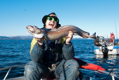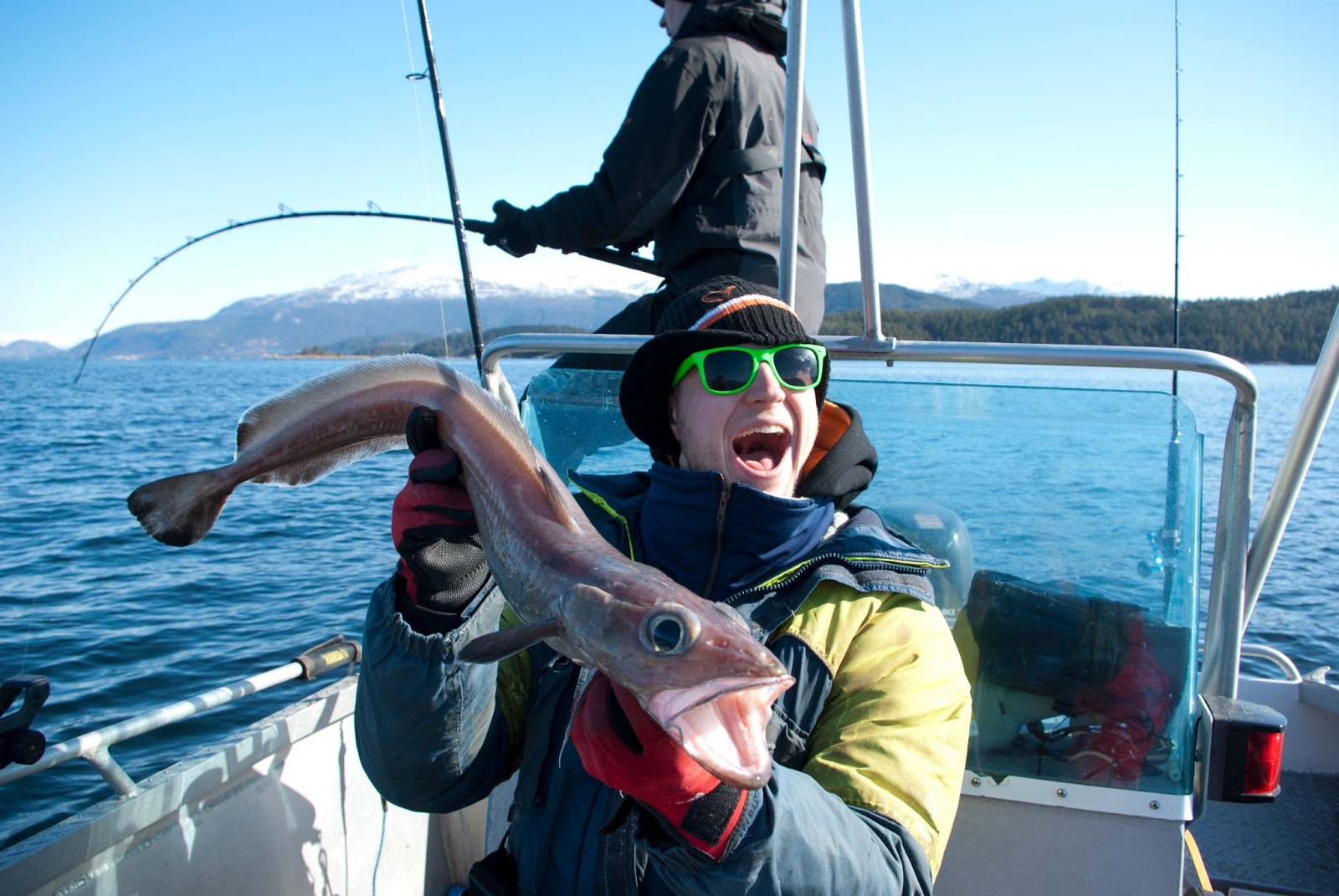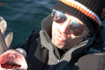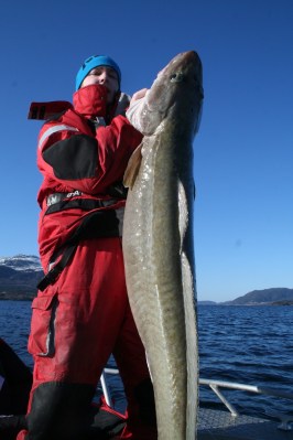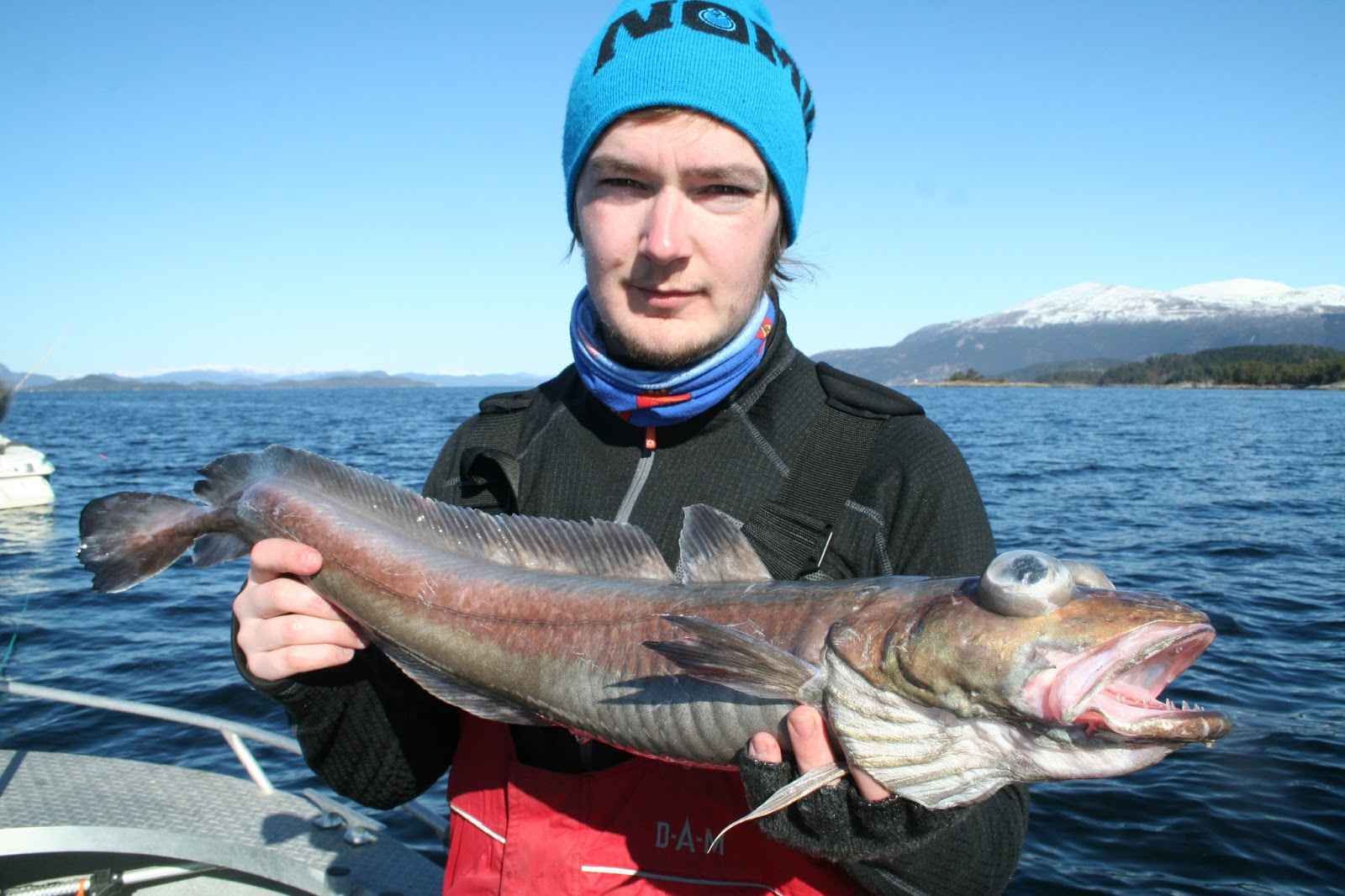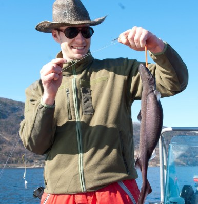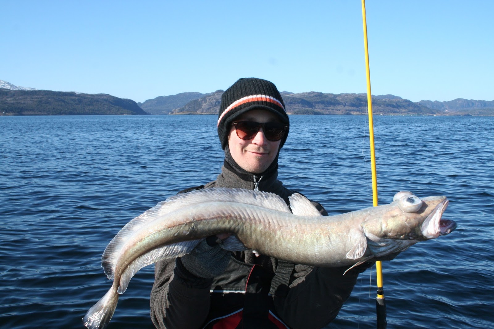 Etter eit kvart sekel i synd og sus, kan eg ikkje skryte på meg å være religiøs. Men gal, det er eg tydelegvis, for neste dag, hadde jaggu meg “trua” dukka opp ijen. Vi dura oss inn i Hardangerfjorden, og kaptein CP hadde fått trua på det djupaste punktet vi fann på den tyskspråklige kartmaskina. Fram til i dag hadde eg faktisk hatt dårligare flyt enn Sven, og som dykk kan lese i Sven sitt avsnitt, er det direkte imponerande på feil side av skalaen. I dag skulle derimot hellet snu ein smule, og eg starta dagen med å perse med ei brosme på 6900 gram! Ikkje all verda, men pers er pers, og fisken var vakker! Eller som bror min sa: “Den ser ut som den er utstatt for radioaktiv stråling.” Blid vart eg okke som!