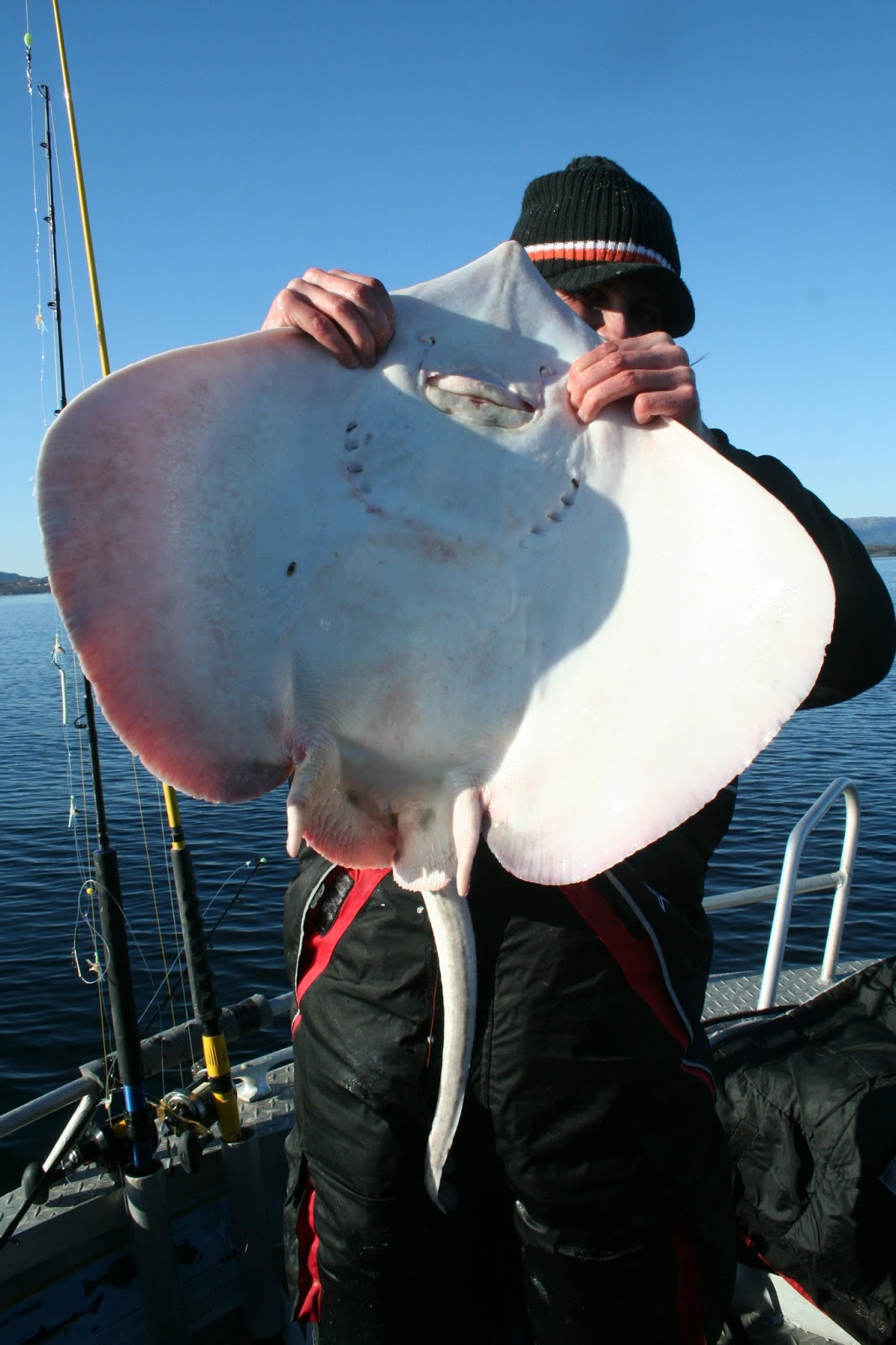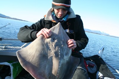Men alt dette blir ubetydlig når det kommer opp hvitskate. Denne sjeldne og biotopkresne albinoskata som forskerne ikke helt klarer å bestemme om hører til de runde skatene eller de spissnutede. Dette er en drømmefisk, og etter min mening Norges nest kuleste fiskeart. Og den er, så vidt vi vet, aldri tidligere tatt på stang i Hardanger eller Hordaland for den del. Den er tatt flere ganger på line innover i fjorden, og den har ligget i bakhodet hver gang jeg har et agn liggende på bunnen på betydelig dyp. Den kom også så ut av det blå, etter 7 timer med sedvanlig hågjelaction. Og det beste av alt var at kameraet rulla under hele sekvensen. Fistelstemmer, galskap og hysteriske skrik gikk etterhvert over i tomhet og hiksting.