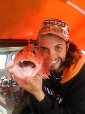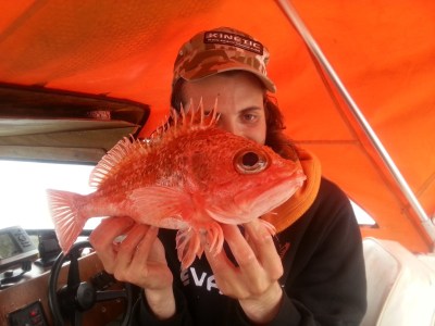 Kl 09 var det ut igjen etter de blå. Vinden var kraftigere i dag og regnet bøtta ned. Da var det fint med kalesje. Vi prøvde oss på en annen kant idag, og rigget oss til med joggedress, kanelboller, cola og Radio-rock, og dytta stengene ut av det oransje teltet vårt. Første drift gir raskt fast fisk til oss begge. OC med den obligatoriske hågjelen, men hos meg var det litt mer jazz. Ut i hølje-regnet kunne vi se at en blåkjeft var på vei mot båten, og størrelsen var fin!