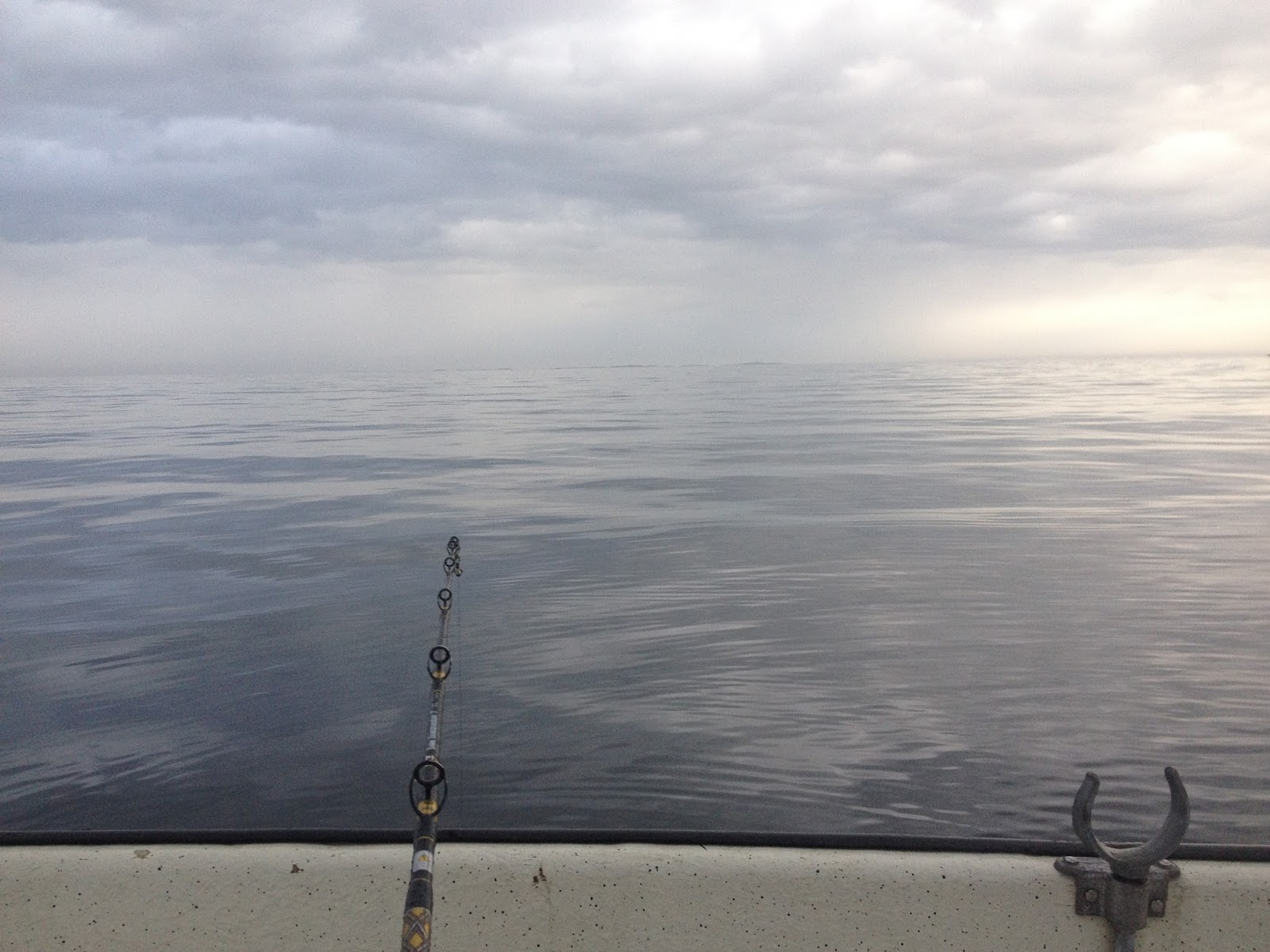 Den aktuelle dagen (tysdag), regna det i bøtter og spann, men vinden var ikkje av verste sorten, ganske perfekt driftfiske-vind faktisk. Skjølv om eg var effektiv og gjorde meg klar rett etter jobb, var Kalland treig denne dagen, og eg låg og vreid meg i båten med store fiskeabstinensar og til dels kramper i heile 50 minutt før han dukka opp.