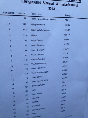 Etter innveiing, dusjing og pilsing på campinghytta dro vi ned til den yrende byen igjen. En hel dag med kun imsdal og mariekjeks gjorde at Papas pizza var særdeles kjærkommen, og den ekstra hotte jalapenoen var perfekt til å skylle ned ølen med. Vi rusla så ned til ett av telta på kaia, her var det afterfish med info om dagen samt noen utlodningspremier. Bjørn dro på seg fetter-Anton-krøllene og stakk av med et usedvanlig flott svarthvitt ekkolodd. Mer givende var det å prate skit med andre deltakere, juge litt om fangster og plasser og grave litt om morgendagens planer. Har noen funnet silda? Vil sjøen legge seg nok til å komme utaskjærs? Osv. Ekstra moro var det å hilse på våre svenske bloggvenner og mangeårige deltakere i Langesund, Team Isola Lowrance. Gutta på Isola er med i toppen hvert år, så her var det bare å spisse ører og lytte til erfarne konkurransefolk. Imens ble resultatet fra dagen slått opp utafor teltet, og vi kunne konstatere at vi hadde gjort det forholdsvis bra med en foreløpig 11. plass (av 60 lag) med poengsummen 466,63. Vi skrudde raskt opp målsettinga fra 500 poeng til 600 poeng og topp 20. Vi visst at søndagen ikke vil bli like poenggivende som lørdagen, ettersom dypet var utelukket med vår begrensa rekkevidde. Men nye 150 grunnepoeng burde la seg gjøre. I god tid før noen ble ufyselige forsvant Isola brått, de hadde dratt på taktikkmøte infor morgendagen. Tilpasningsdyktige og lærenemme som vi er gjorde vi også oppbrudd og trakk oss tilbake til vårt egne veldig viktige taktikkmøte.