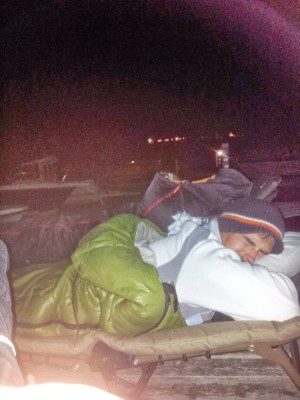 Ved ankomst Trondheimsfjordens dypeste punkt tok vi en kjapp rådslaging om vi skulle begynne å fiske nå eller om vi skulle avvente inne ved båthavna. En tiltagende sørøstlig liten kuling var råd nok, og vi bevegde oss i kortesje inn til smulere farvann. Inne i havna lånte vi to ledige båser til båtene og satt opp bed-chairs på brygga med ryggen mot vinden. Det ble pottis, pils, capt’n og cola og fenalår, og endelig god gammel NKPL-stemning på tur. Etterhvert ble det lenger mellom steinsmettene og vi slokna etterhvert i posene.