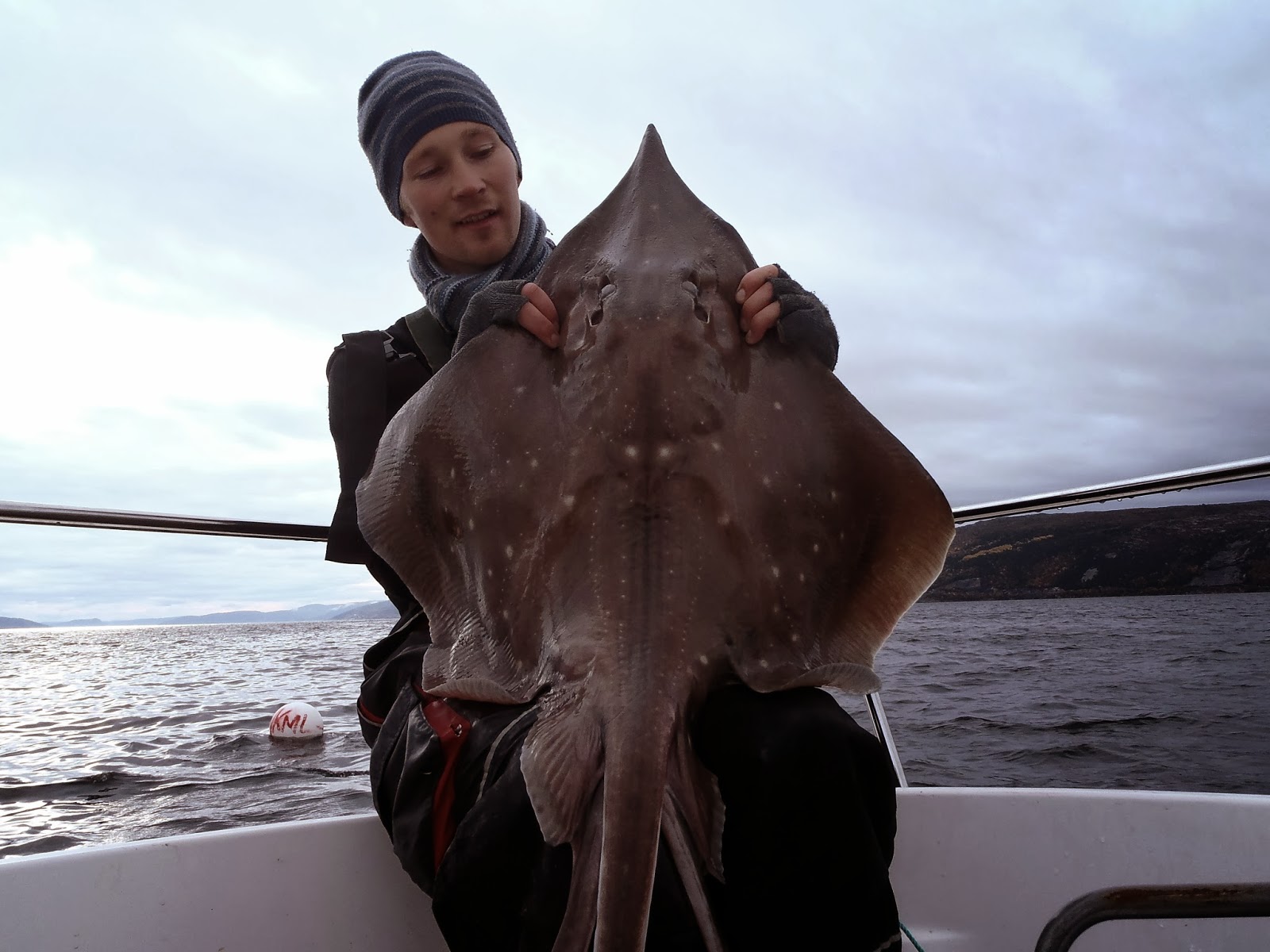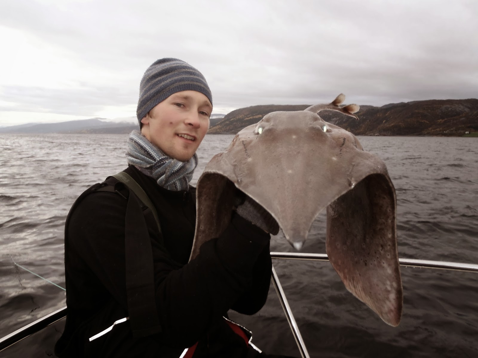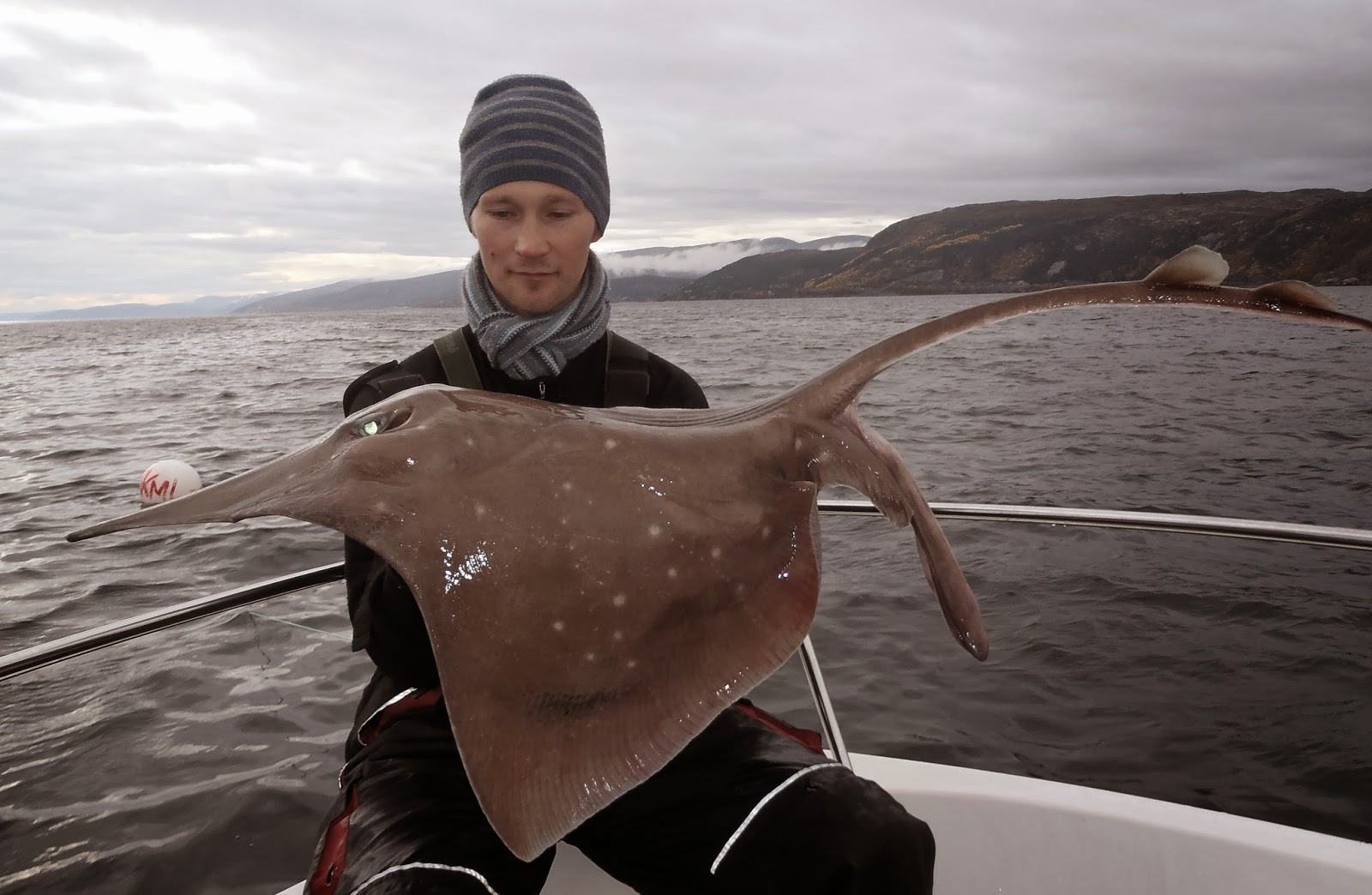 Da var det klart for årets håkjerringtur og tre NKML-ere var klare som egg. Etter fjorårets bingotur med hele fem fisk var forventingene denne gang avmålte. Men vi måtte da prøve, fiske på 600 meters dyp er jo spennende uansett! I år som i fjor satt ankeret fjellstøtt og vi kunne starte fisket i 9-tida lørdags morgen. Etter at agna er planta godt nede på mudderbunnen kommer det fra Bjørn at han kunne jo like godt venta til neste nedslipp, for det kommer jo aldri noe på første slipp uansett. Etter ti minutter runna det på stanga hans. Det var nære på at det gikk troll i ord, men dessverre var det ikke fast fisk. Nye ti minutter seinere var det noe mistenkelig på min stang, så jeg løfta den av holderen og prøve å kjenne etter. Noen minutter seinere orka jeg ikke vente lenger og satt tilslaget, der var det jazz! Jevnt tungt og uten bevegelse, akkurat slik vi liker det. Det var bare tre alternativer, spisskate, svartskate eller breiflabb. Og kulheten i den situasjonen gjorde at 700 meter sveiving gikk lett som en plett. Vel oppe viste det seg å være en skate, type spiss. 8 kilo hannskate og kroken satt klokkereint i kjeften. Dette var min tiende av arten, så etter noen kjappe bilder og gjenutsetting tok jeg meg en velfortjent pils. Vi fortsatte å fiske. En times tid seinere har Calle action, men heller ikke han får kontakt med fisken. Vi fisker på i noen timer til, men snart snur strømmen og vinden tar til, så vi innser at vi ikke gidder mer. På vei tilbake til Trondheim kan vi være enige i at det var en fin tur, til tross for noe magrere resultat enn fjoråret 🙂 <3LoLz koZ og rosa elefanter+