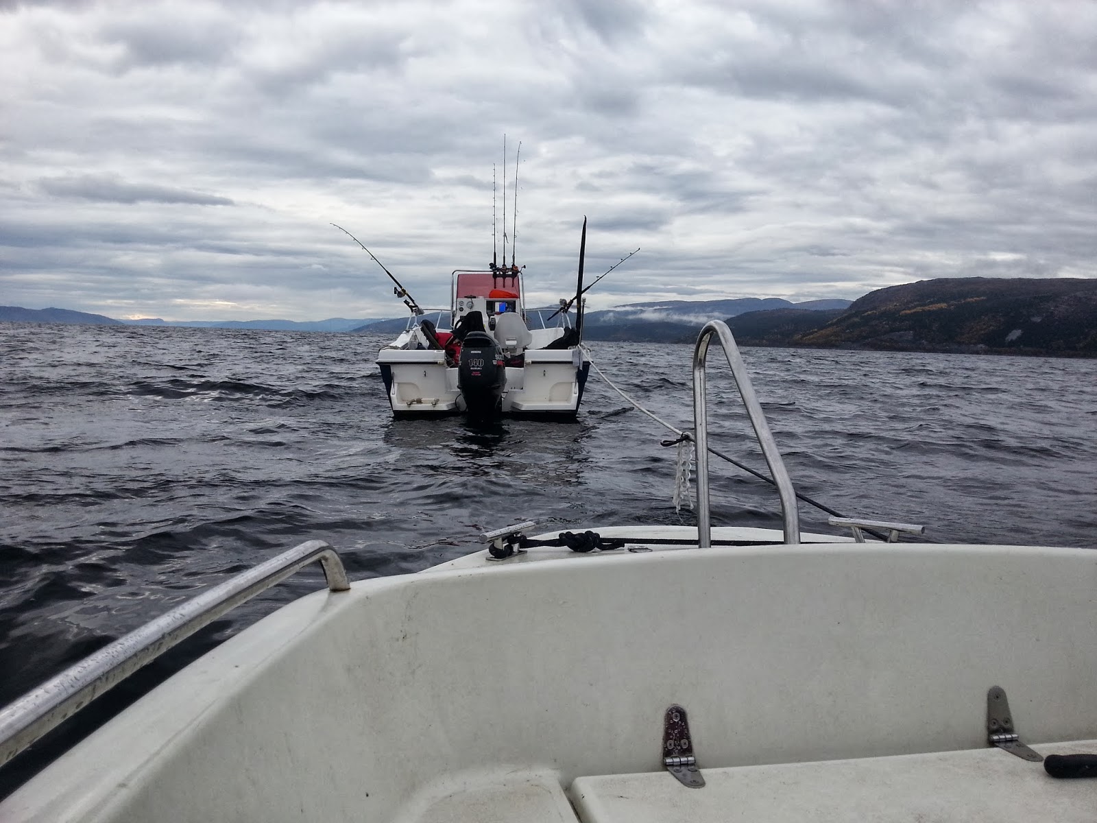 Stemninga var god, og nå skulle de store tas. Alt lå til rette nå. Vi rakk ett nedslipp til, men så snudde vinden. Ikke bare snudde den, men den tripla seg+ i styrke samtidig. Og vi som til nå hadde ligget i en ok balanse mellom strøm som jobba sørover og vind som jobba nordover, skøyt nå fart rett øst på tvers av skipsleia og over mot østsiden av fjorden. Så snart vi hadde kryssa midten av fjorden ble vi tatt av det nordgående strømbeltet og da var det gudd bai til ankerfeste. Med ankeret på slep og mens snellene knarra ut sene i et skummelt tempo satsa vi på at vi snart skulle få feste igjen. Det gjorde vi også. Men det var 2 nautiske mil senere. Snellene var tomme, båten lå oppe i kanten på 400 meters dyp, og ankeret var festa seg i det som må ha vært en kabel. Klokka var knapt 3 på ettermiddagen, og vi hadde fiska effektivt i kanskje fire timer.