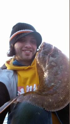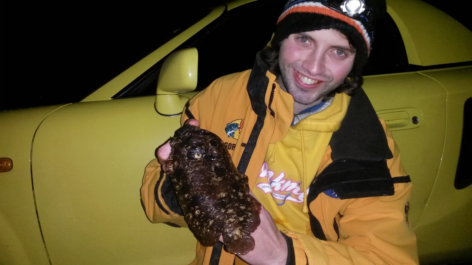 Jeg flekka til med et duRagelig tilslag med skogseiden, og i andre enden kjente jeg tung motstand. Fisken slapp taket fra steinen og vips så lå den kule flatfisken i fanget mitt. “Den e diiiger”, hyler jeg. John Olav løper rundt til min side, og Irvin som satt litt bortenfor å lyste gjorde det samme. Lengden var ikke så imponerende, men den var helt klart mye større enn de 2 jeg har fra før på 110gr og 126gr. Tykkelsen på fisken var enorm, og min første assosiasjon var en Londonbuss, type dobbeldekker+. Jeg smilte og koste meg, for en fisk! John Olav derimot, som ikke trodde denne var noe stor når vi så den nedi sprekken, innså at han hadde gjort det samme som i høst; Utilsikta gitt bort muligheten på en potensiell norgesrekord til minsten… Greie bror 🙂