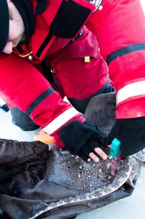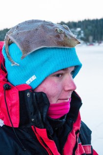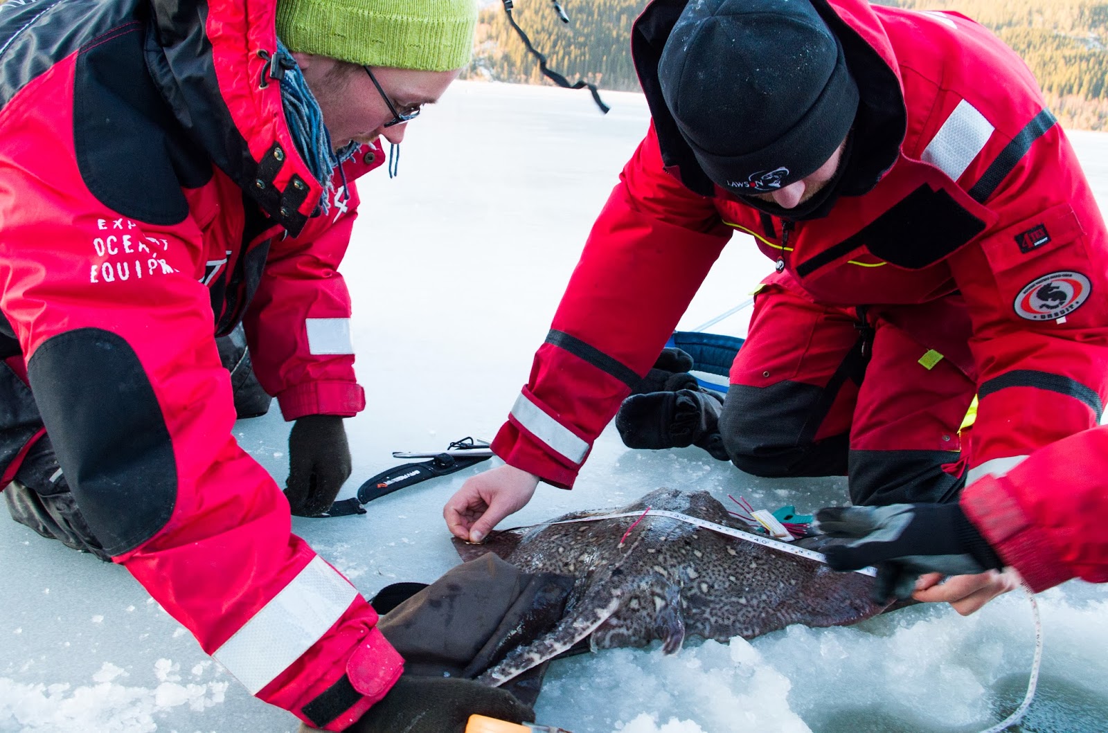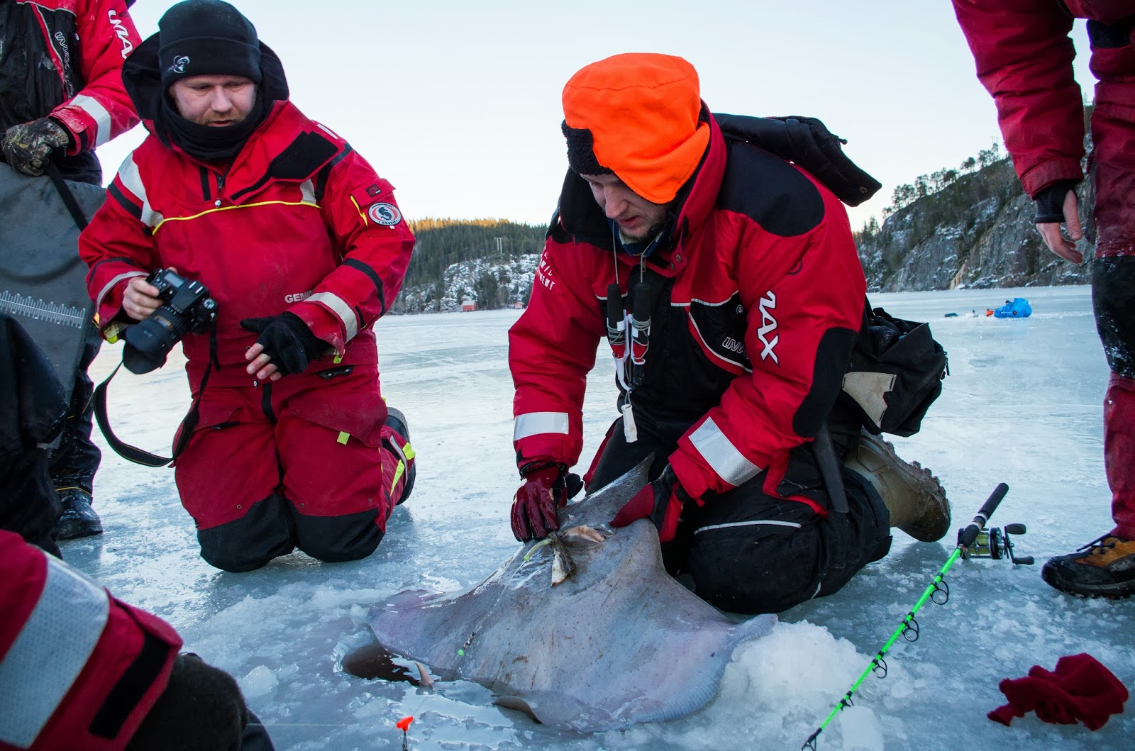 Nå er vi over i håndteringsfasen. Hva gjør man med ei skate på isen, om man har planer om å slippe den ut igjen? Både slimlaget som dekker skatene, og øynene er sårbare for kulde, så det gjelder å være effektiv. Avkrokningsmatte eller et slags underlag å ha mellom fisken og isen, i tillegg til annet utstyr bør ligge lett tilgjengelig. Det er fint å ha med seg en kompis slik at man kan holde fisken nede i hullet med et godt grep om vingene, snuten eller halen, mens man finner fram vekt og målebånd. Øyne og slimlag må for all del ikke utsettes for kulde over lengre tid! En kan gjerne gi fisken “pauser” nede i vannet om ting tar litt tid.