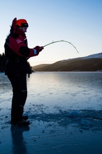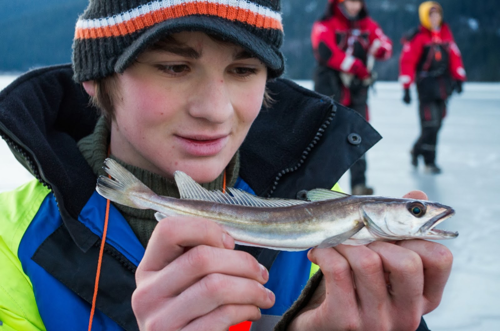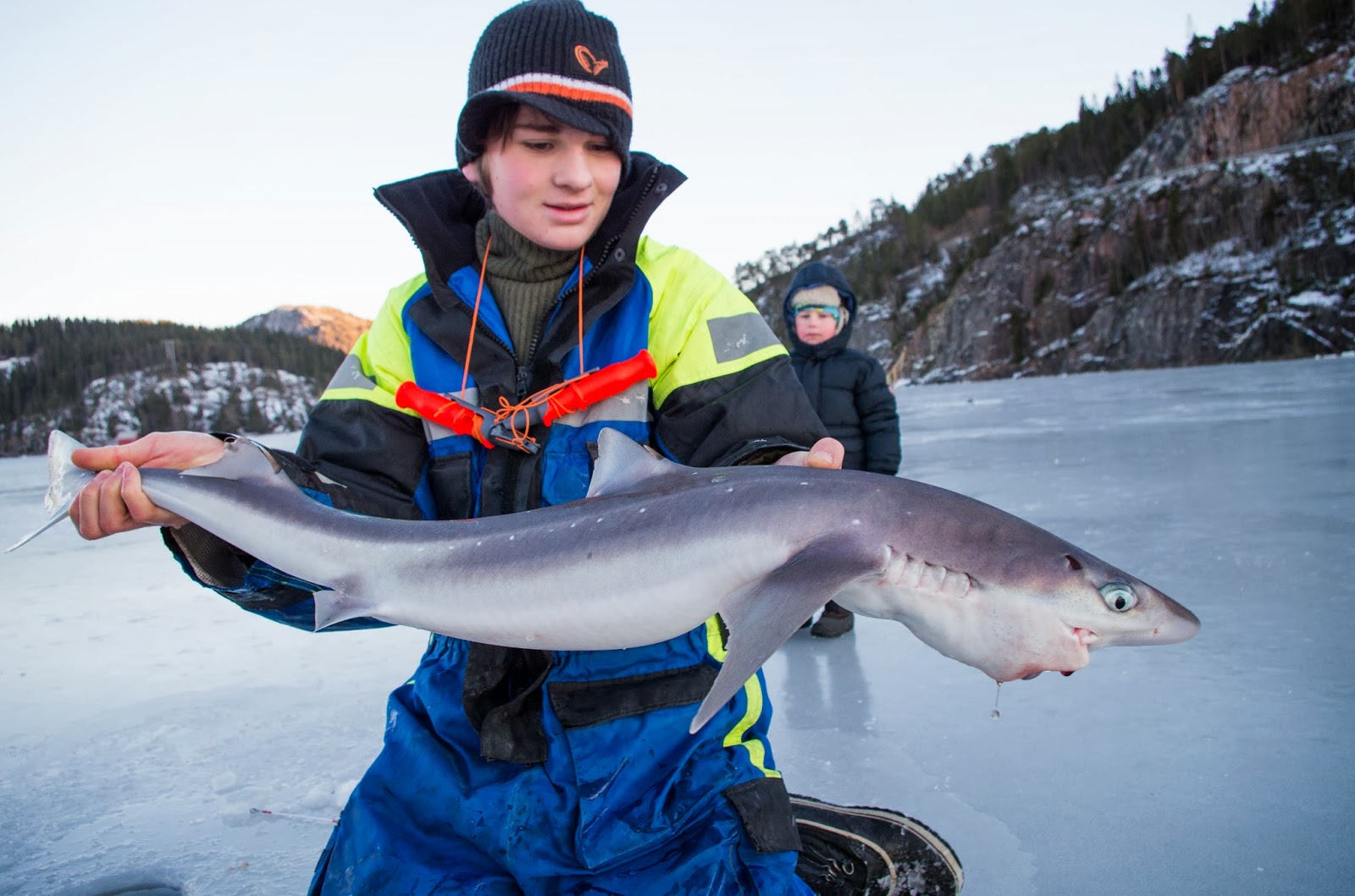 Med en kombinasjon av rygging, hjelp til å holde lina stram, og bitter sveiving på ei snelle som var redusert til ei rusten kaffekvern fikk Sindre til slutt fisken opp til iskanten. Den er spiss! Herrejemeni.