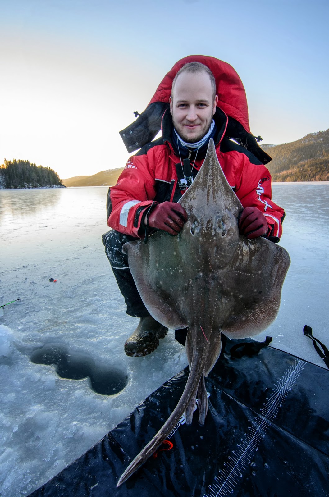 Den tredje skatarten på isen denne dagen gav kanskje ikke noe jubelbrøl, men var desto mer sensasjonell. Dette er en skateart som vi tidligere har trodd at kun levde adskilt fra piggskatene. Jeg snakker selvsagt om kloskate. Den er tatt flere steder i Namsfjorden, men er altså aldri registrert inne i lekegrinda i Løgnin. Før nå. Vetle Westli sto for fangsten, et relativt lite eksemplar på rundt 400 gram. Dette beviser nok en gang at det er snakk om en fjord full av overraskelser.