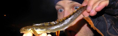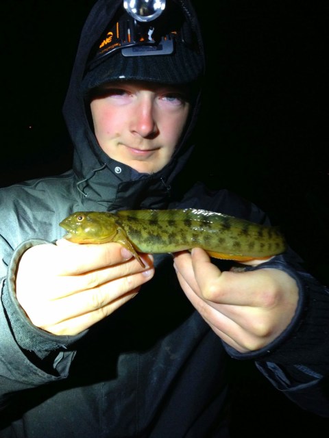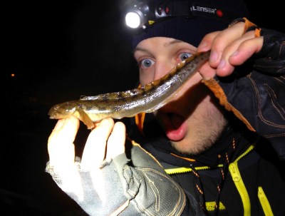 Neste stopp var ei runde å kike etter hårvar, men denne var heller ikkje å sjå, så vi pilte vidare til neste stopp, som var ålekvabbe. Dette er ein av dei “pisslette” artane som eg mangla, men etter litt kiking, lysing, og fisk som hoppa via handa, brygga og ned att i vatnet, fekk eg endeleg buksert ein av desse sleipe beista opp på graset. Art nr. 64 var eit faktum!