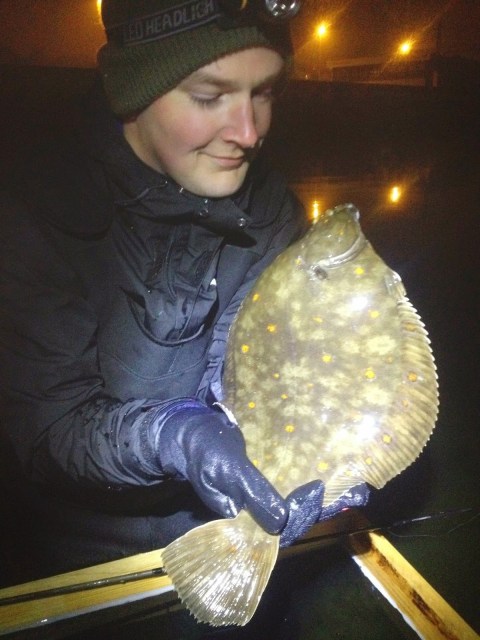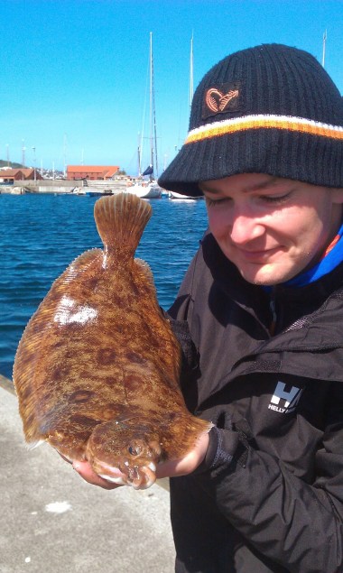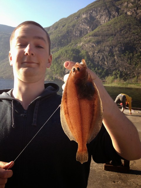| Adrian med gapeflyndre. Ein kan òg skimte ræva mi i bakgrunnen. (Foto: Irvin Kilde) |