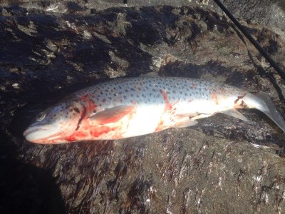 På vei attende til bilen fekk vi oss ein god støkk. Adrian heldt på å gå rett på det vi andre to fyrst trudde var tang og stein. Det skulle derimot vise seg å være Gammal-Erik sjølv av ei ulke som låg der, og den var ikkje vanskeleg å be! Og vips, der var ny pers og klubbrekord trygt oppe i tungevindauget!