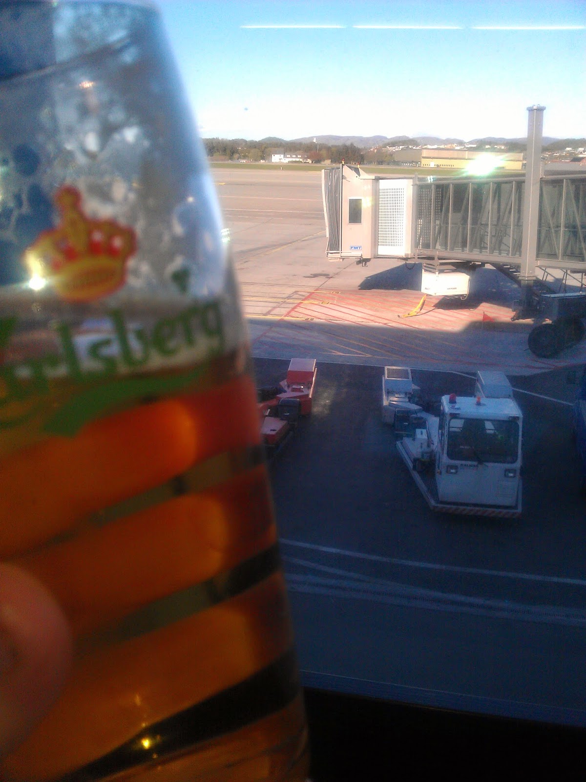 I halv fem-tida, pakka vi sysakene, og brødrene Kilde dumpa meg på flyplassen nokre timar tidlegare enn planlagt, slik at dei kunne rekke femtråda tangbrosme-bonanza på motsatt kant av landet same kveld. dette var eigentleg heilt greitt, sidan eg hadde behov for tre timar og summe meg på før avreise. Eg rakk både å pakke om bagasje, skifte kle, ete pizza, og bøtte inn 3 pils. Nett som i syden.