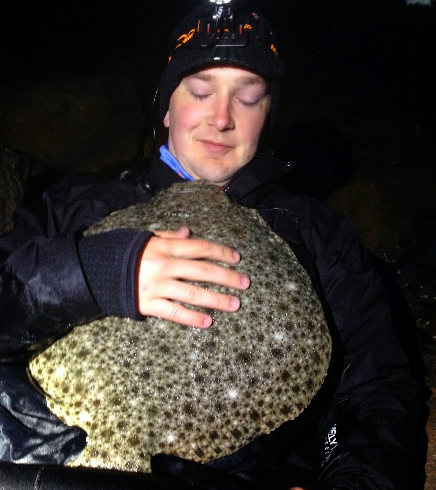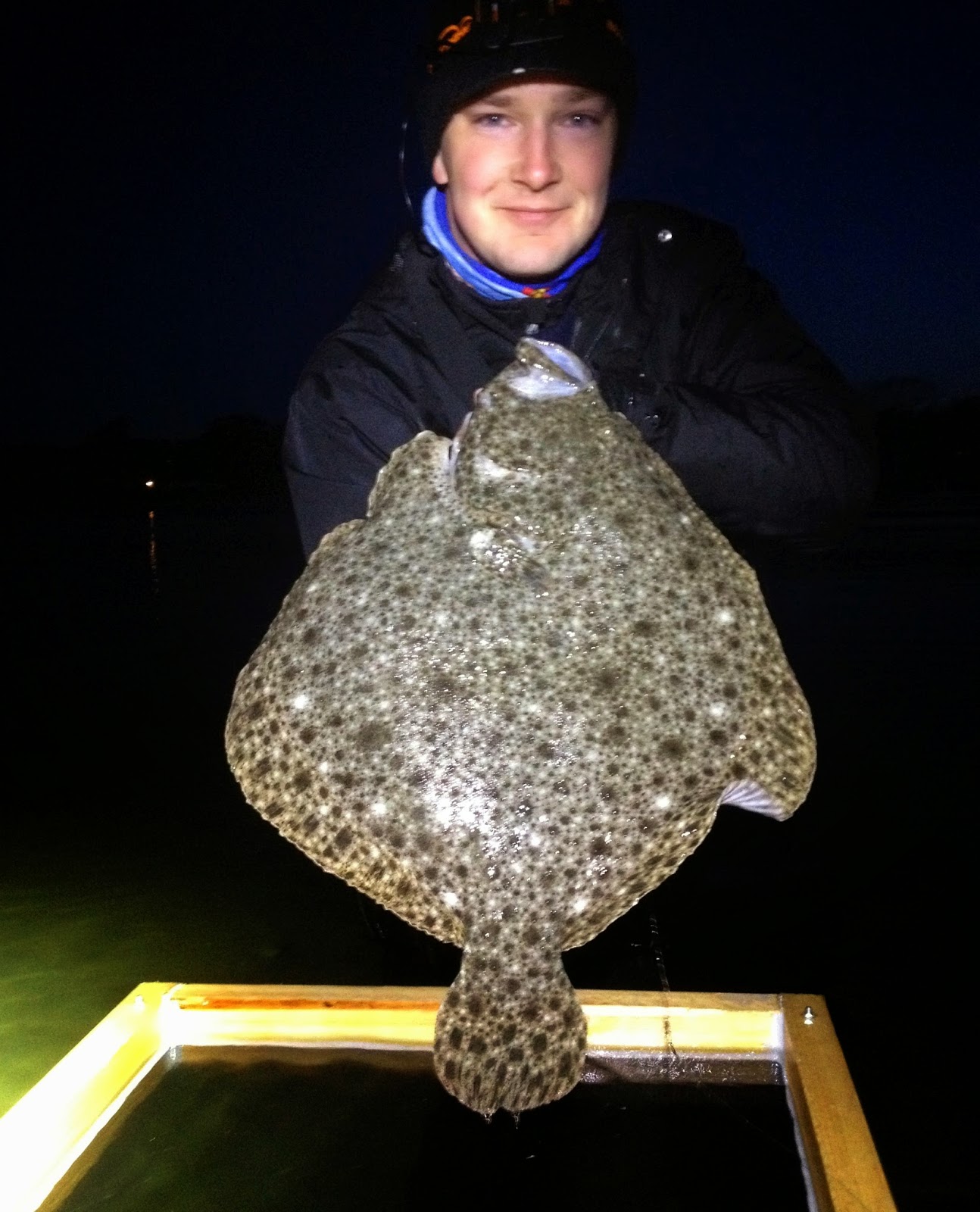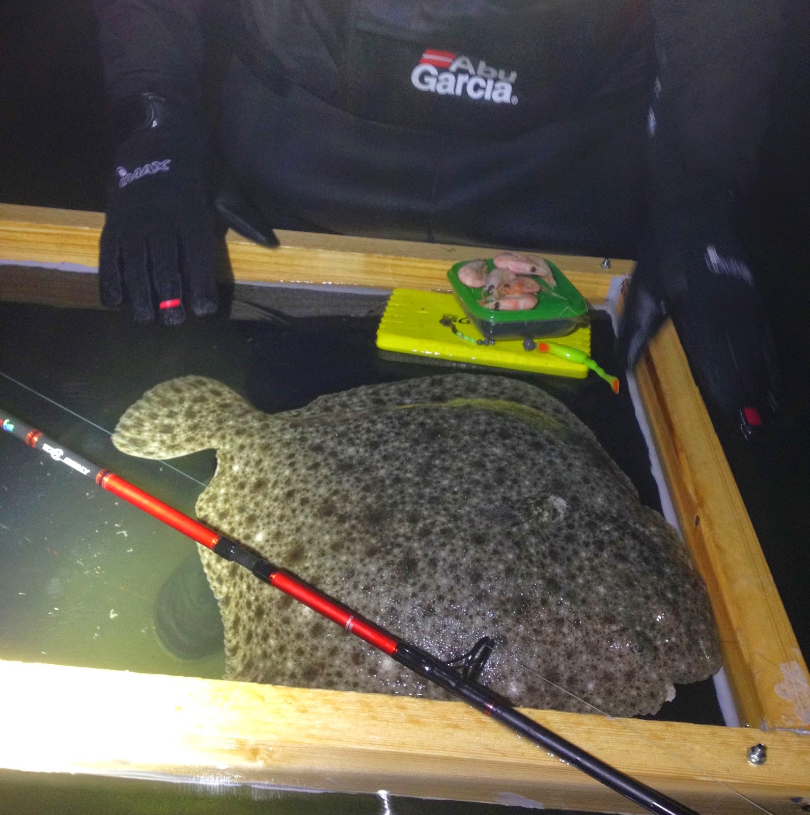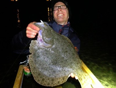 Vaser litt videre uten mål og mening, ser ytterligere en liten piggvar som jeg ikke gidder å fiske på. Fått større lizm. Itsje vits. Art 110 og drømmepiggvar på en kveld, jeg er ekspert og skuldrene har falt ned til under brystet. Tror jeg plystrer litt muntert på dette tidspunktet og. Så ser jeg Adrian litt bortafor som hyler noe ubestemmelig og beordrer meg strengt til å komme bort. Etter å ha vada for livet nærmer jeg meg og hører hva som er i gjerde. Han står å ser på en stor piggvar, som han minuttet tidligere hadde tråkka på. Piggvaren hadde heldigvis bare seget noen meter videre og lagt seg ned igjen, og nå sto han å nistirra og turte ikke å la den gå ut av syne. Min stang var ferdig rigga med jigg, så jeg hender den over til bror som nå fikk hilse på akutt fiskeskjelven han og. Vi hadde ikke helt troa på at den ville være med å leke etter å ha blitt tråkka på, men etter bare noen sekunder smatter den på jiggen. Adrian beholder roen, og snart er hele jiggen inne i kjeften. Han avventer et halvsekund – heldigvis – for brått er jiggen spytta ut igjen. Fortsatt vibrering og etter ytterligere noen nervepirrende sekunder smeller den til for fullt. Tilslag og smack i backan. Jeg er allerede våt fra lue til sokk så jeg trår til som levende håv. Får den opp på vinduet og ser at den er samme sizen som min.