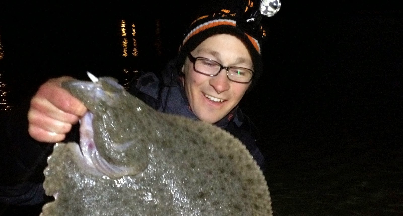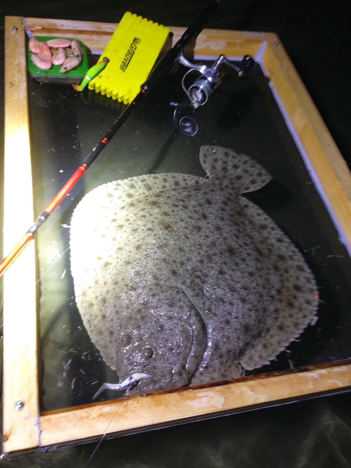Den første flyndra vi ser er ei tunge. Bra tegn+ Den er riktignok bare på størrelse med en håndflate. Jeg kaller bort Adrian som mangler arten, men den er lite interessert i børstemark og vi gir snart opp. Vasser litt videre, ser noen rødspetter og noen skrubber, samt stimer med sjøørret. Går etterhvert litt innover på stranda, og på ankeldypt vann ser jeg den. Jeg ser den bare i sidesynet, for hjernen er hardkopla til å lyse vekk fra fisken inntil stang og agn er ferdigrigga. Jeg er i sjokk, det lille jeg så av fisken var nok til å få den store skjelven. Jeg krøka meg over vinduet vekk fra fisken mens jeg bytta om fra tungetakkel til jigg. Jeg skalv som en tungnarkoman med kald kalkun, og pumpa grusa takta fra Siddisløpet sist lørdag. Og de satans ownersvivlene som er umulig å åpne uten å ha fingra til Melvin Tix… Det følte som det tok en evighet, men jeg tror egentlig det gikk ganske fort. Fokuset var 100%