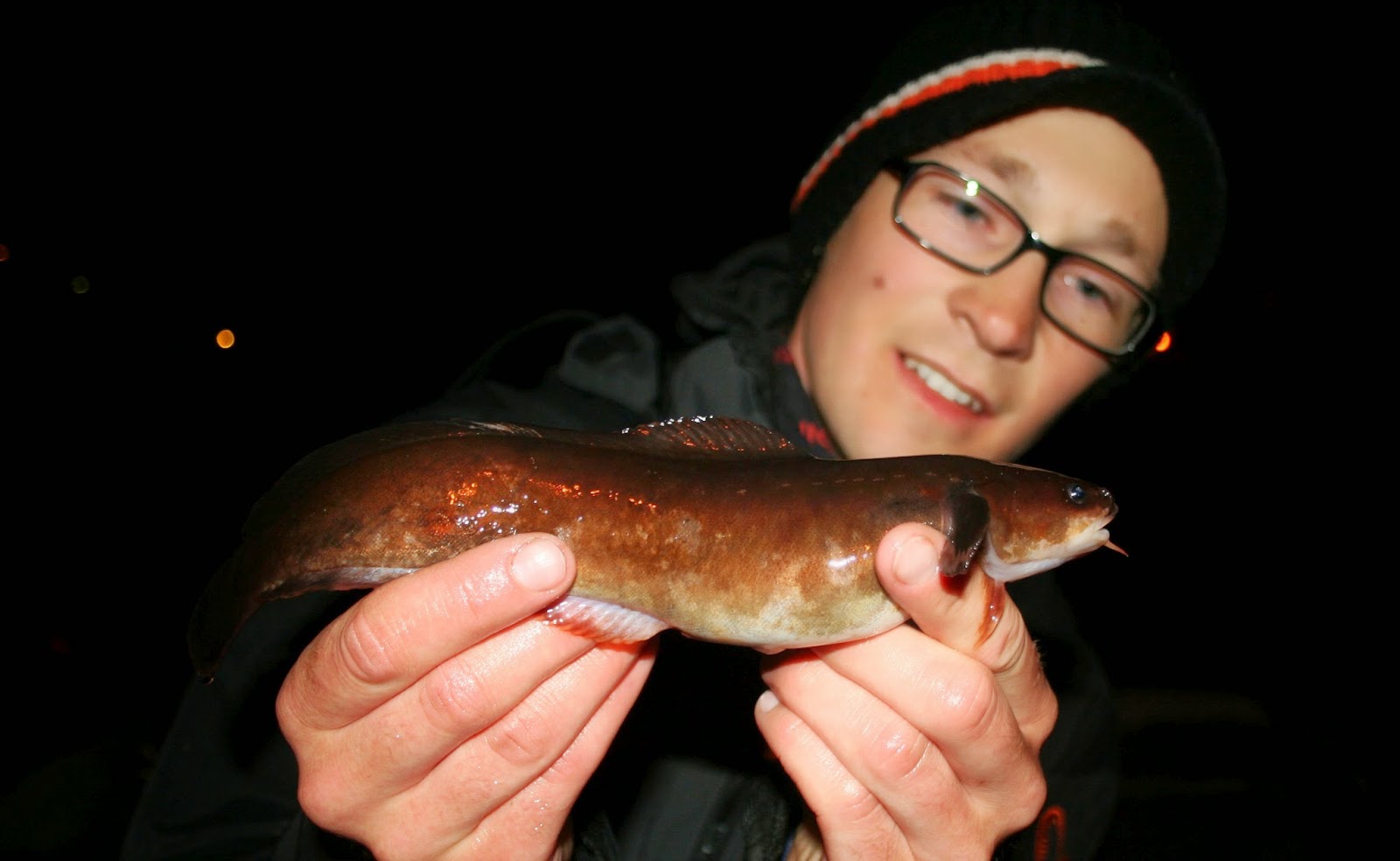 Adrian leiter videre sånn at også han kan få kryssa arten. Etter å ha summa meg litt og studert tangbrosma i karet, hjelper jeg til i leitinga. Vi ser en tre-fire stk, men alle er livredde lys og rygger som en ål så fort lyskjegla nærmer seg. vi ser også flere ringbuker, noen av de temmelig store for arten. Vi snakker sikkert 10 gram (ja vi er to smuler miljøskada her), men bølgene er litt for store til at vi får fiska effektivt på de der de sitter fastsugd til stortaren som flagrer inn og ut med bølgene. Etter litt mer leiting finner Adrian en tangbrosme som fyker rundt på matjakt nede i en smal sprekk. Adrians hodelykt er alt for sterk, så han slår den av og jeg bistår med min som kan dimmes betydelig. Han senker agnet ned i sprekken, men det tar litt tid før tangbrosma finner agnet. Jeg beorder at han må legge agnet helt i overflata inntil steinen, der den smatter i seg noe grums på sutervis. (Vi skjønte da hva de klikkelydene fra steinura var). Adrian heiser agnet oppover, og da får fisken los og nærmer seg bestemt. Siden jeg er øynene hans på dette tidspunktet fortsetter han heisinga av agnet litt for langt slik at den går klar av overflata. Det gjorde tydeligvis ikke noe, for tangbrosma var fast bestemt på at den snacken skulle ikke få stikke unna. Den skyter fart og snapper agnet 3 cm over overflata, og vips ligger den i fanget. Vakende femtråda tangbrosme!
