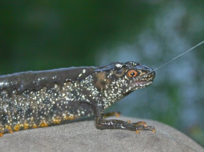 | Storsalamander, en art som lider av å plutselig bli omringet av blodtørste ørreter. |