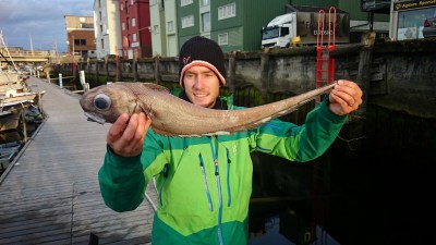 Kort etter at jeg har truffet bunn så napper det. Kan det være så lett? Kroking, sveiving, avkroking og pigg mot bein etterpå, så kan jeg konstatere at vi har funnet svarthåen. Bare å prøve igjen.