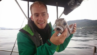 På tredje nedslippet rekker jeg såvidt å stramme opp før jeg får et skikkelig napp og gir etter med stanga mens 1-2 meter snøre går ut. Sveiver fisken på sirkelen og kjenner skikkelig tyngde. Fint det, bedre med én skikkelig hågjel enn fem svarthå tenker jeg mens jeg sveiver oppover. Når tacklet kommer opp ser jeg no hvitt langt nedi vannet og tenker først at det må være en liten lange som har vært på tur langt over bunnen. Først med 3-4 meter igjen skjønner jeg at det er skolest. I motsetning til i fjor får jeg ingen skjelv, bare en voldsom lykkefølelse. Med tommelen i kjeften løftes skolesten inn i båten og jeg ser den er mye større enn den jeg fikk i fjor.
