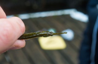 Om dette er det samme som resten av Artsfiske-Norge refererer til som “mysis” vet jeg ikke, men jeg ser for meg at det nok er noe av det nærmeste jeg kommer nålefiskenes diett. Eksemplaret jeg hadde sett dagen før var dog lite nok til å spise dyreplankton, men jeg lot det stå til og sykla videre med et ørlite snev av troa.