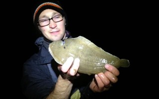 4. Tangbrosme og piggvarpers. Første mai-helga har vært ensbetydende med fisketur de siste åra, og denne første mai-helga skulle utpeke seg som en høydare blant første mai-helger. Adrian og jeg hadde satt kursen østover med mål om vade- og kikkfiske i gamle hjemtrakter. Første prioritet var femtråda tangbrosme som mange hadde rapportert om i ukene forut. Ikke bare ble det full pott og bingo på første forsøk for oss begge, jeg var så heldig å lande det største eksemplaret som er tatt til nå. Ny sportsfiskerekord på femtråda tangbrosme, 168 gram, og årets tredje nye art. Men kvelden var enda ung, og vi bestemte oss for å fortsette fisket en annen plass, nå med vadebukser og vindu. På et par timers vandring med nesa ned i ruta finner vi flere fine piggvarer, og både Adrian og jeg flekker opp hver vår over 3 kg. Grusing av pers på begge. FOR en nydelig fisk! Rapport.