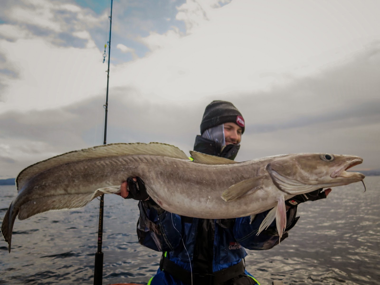 Da jeg nærmet meg blåkjeftområdet, måtte jeg allikevel ta et lite stopp. Den lettere stanga var jo allerede rigget for blå, så her var det bare å vippe på et par store agn, og kaste ut. Jeg rakk knapt å stramme opp lina etter å ha nådd bunn, før de karakteristiske hissige nappa til blåkjeften var på plass. Jeg smeller raskt tilslag og i andre enden svarer det med tyngde og jevn motstand. Akkurat slik en blåkjeft skal oppføre seg. Et par hoderisstinger på veien oppover gjorde meg enda sikrere, og jeg strakk meg etter håven allerede halvveis under oppsveivinga.