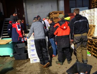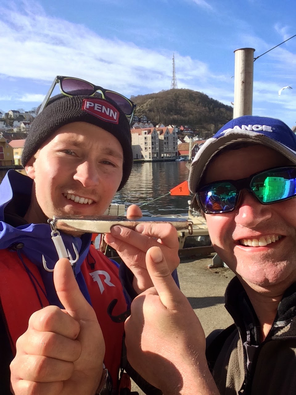 Utror var satt til kl. 10, med oppmøte på kaia kl. 9. Stemninga var stressa men god på Fonn fiskemottak. Hilste på flere i Nord-Jæren for første gang, bl.a. Øivind Andersen (som jeg bodde på hotellrom med) og Bjørn Stein (med det morsomme etternavnet). Thomas Skarstein hadde jeg truffet før (Langesundfestivalen), og Håkon Taranger fra SDSFC kjente jeg også gjennom artsfiskemiljøet. John Olav derimot fløy rundt som en stressa veps og hadde ikke tid til annet enn hej hej (rakk heldigvis å presse inn en pilkeselfie). Ellers var det flere kjentfolk fra andre klubber også. Tor Arne Rygg og Lars Hellum har vært med på NM i sjøisfiske på Lygnin i flere år (og vunnet stort sett hvert år), og nå skulle jeg konkurrere på lik linje med disse. En annen av kjempene fra Oslo, Bjørn Bakkelid, fiska jeg håkjerring med i 2008. Bare ikke spør Bjørn hvordan det gikk 🙂 Dan Aarsvold og Kristian Hausken er også kjente gjennom interwebben. Førstnevnte var i samme båt som meg (billedlig, debutant), mens sistnevnte er 15 år men med skills som voksne menn misunner.