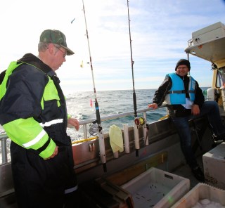 Dagen begynte ekstremt bra, i det at havet var stuegulv og strømmen var fraværende. Vi fiska stort sett rett ned, og ganske effektivt. Men, det hjelper jo lite når havet er klinisk reint for fisk. Bortsett fra en torsk rett over målet dunka jeg til med en 3,5 kilos lyr ganske tidlig. Den tok på opphenger i det jeg i et kreativt øyeblikk la pilken ned på bunnen. Siden jeg heller ikke fikk noe på pilken, bytta jeg den raskt ut med slep og opphengere og fortsatte dagen med ulike varianter av dette. Det var få rundt meg som fikk noe på pilk også, med unntak av Øivinds 6+ torsk som også ble dagens største fisk. Dagens båt var Vågsbuen, en større og mer stabil fiskesjark, med god dekksplass. Jeg hadde plass nr. 1 fremst på styrbord, og hadde masse boltreplass og fritt innsyn til ekkoloddet gjennom sidevinduet. Uten at det hjalp noe som helst. Det var mye registreringer hele dagen, men enten hadde fisken lås på kjeften (feil månefase, tidevann og/eller vindretning) eller så må det ha vært sil eller noe sånt som har for liten munn til utstyret vårt. Videre styrbord satt Stein Kareliussen fra Oslo HK, så Karl Johan Nilsson og Øivind Andersen fra NJHK, og fremst babord senior Terje Ludviksen fra Torungen.
