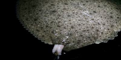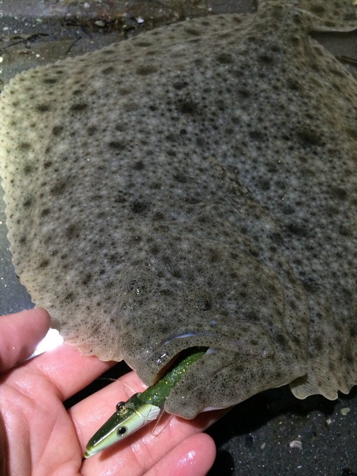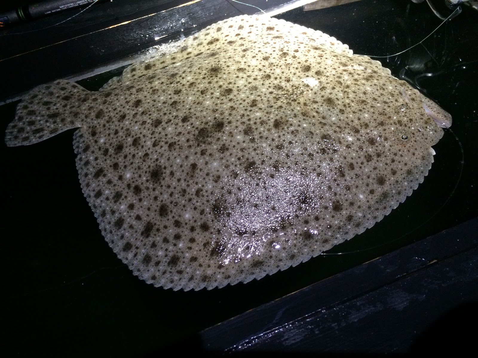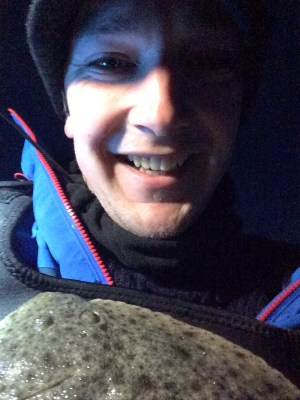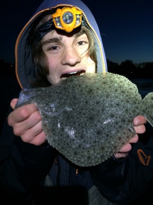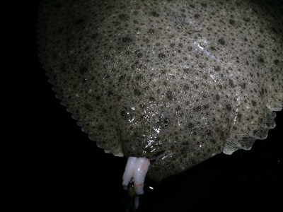 17 tunger på 200-300gr seinere og hele kroppen roper “stopp!”. Ved siden av en stor stein ligger et omriss av en piggvar på størrelse med et amerikansk dasslokk. Jeg kjenner blodpumpa starte umiddelbart mens jeg tar 3 små steg bakover og svinger hodelykta forsiktig vekk for å bytte til sandeel. En liten evighet seinere og fisken ligger fortsatt på samme sted, det tyder på at jeg ikke har skremt piggvaren nevneverdig med lys eller bevegelse. Jeg guider sandeelen i retning mot målet og rykker jevnt men lett i stangtuppen for å lokke fisken til å agere. Det tar få sekunder før den glefser grådig til og den overrasker meg såpass at jeg ikke rekker å slå til umiddelbart. Sandeelen blir spyttet ut, men piggvaren virker fortsatt interessert. Litt mer lirking og rykking må til før den lar seg overbevise for andre gang og nå var det piggvaren som ble overrasket.