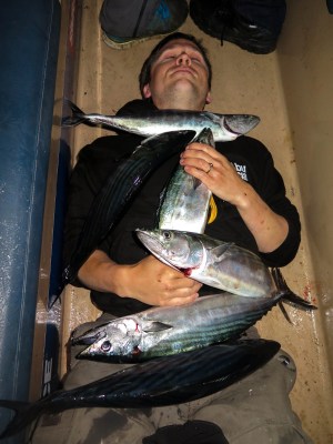 Det er nå tid for meg til å prøve igjen med fire wobblere svømmende etter Carl skute. Første nappet etterfølges av et voldsomt utras og jeg lurer på om pelamidene virkelig er så spreke at de drar ti meter snøre ut av en Tekota 600. Når fisken kommer inn til båten ser vi at den dessverre er feilkroka. Fisk i båten, Carl fant fisken igjen, men dessverre ikke tellende som art.