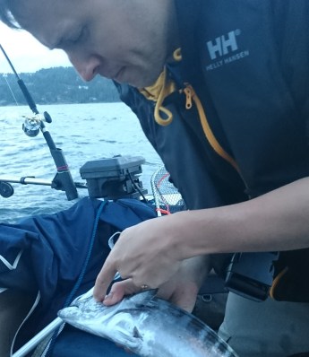 Usikkert hvem som var mest letta i båten når Bjørn fikk pelamide.