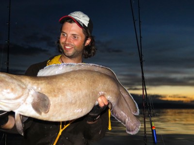 Etter mange timer med null action skjer det masse i løpet av sekunder. Og ja det var skolest. Når jeg ser den stige opp mot overflaten i det krystallklare vannet, kommer den herlige følelsen i hele kroppen. Den følelsen som kun en virkelig godfisk kan lokke frem. Håven har vikla seg inn i dupp-takkel og horngjel, så jeg strekker armen ned i vannet og griper den med et skikkelig tommelgrep rundt underkjeven. Jeg har ikke blitt helt vant til å dra skolest enda. Følelsen av å lande en er forstatt helt rå! Denne var attpåtil DIGER! Jeg flekker den opp på vekta, og 2-kilos merket er long gone… 2200gram!! Den nest største stangfangsten av arten noensinne. Audun og Christer kommer inntil båtripa for å se dyret, Sven fotograferer. Jeg poserer og slurker øl. For et dyr og for en dag! Jeg satt her nå med en latterlig stor skolest og en pen horngjel mellom beina. Et noe uvanlig, men allikevel helt greit dobbeltrun.