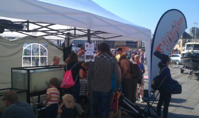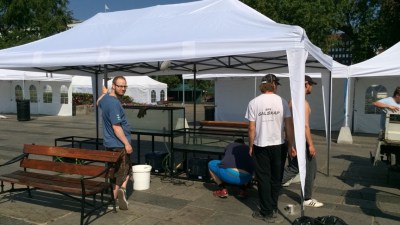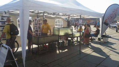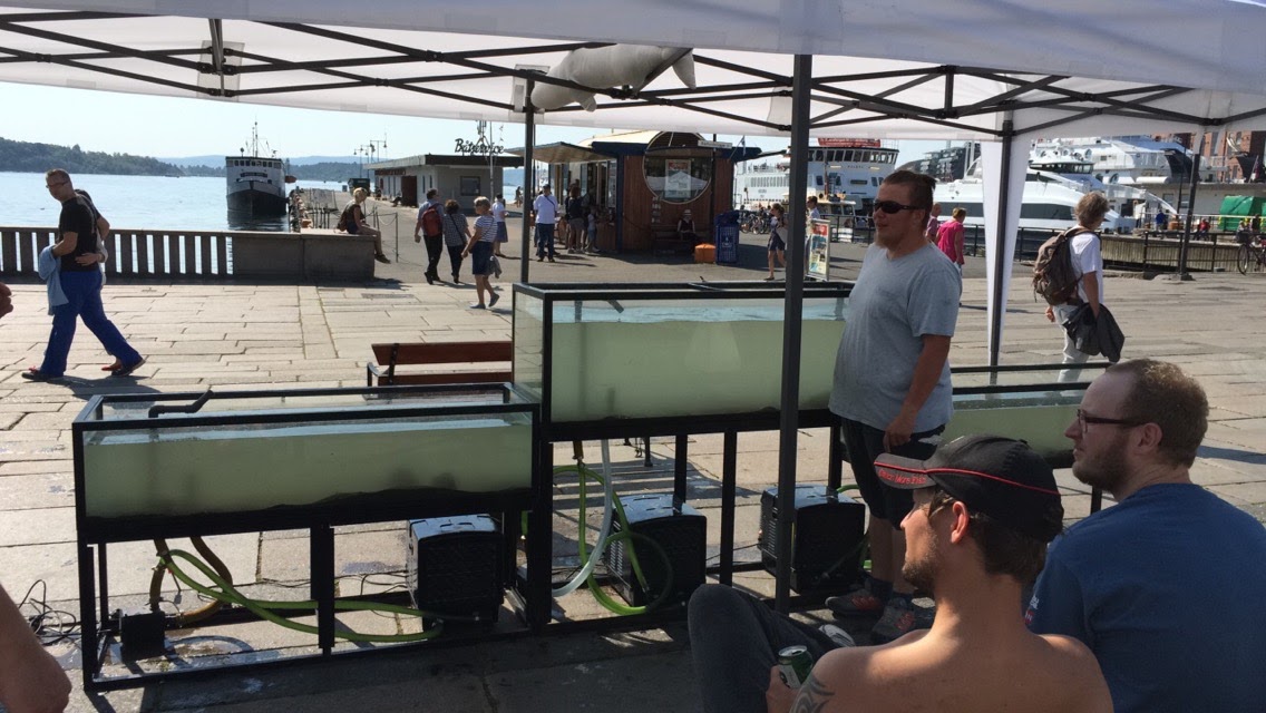 En liten time senere var vi på plass i Oslo for å montere og fylle akvariene med vann og fisk. Været var strålende og det var god stemning blandt reisefølge og på Rådhusplassen generelt. Flere og flere som hadde stands å rigge dukket opp og nysgjerrige forbipasserende begynte å komme innom akvariene våres. Vannet i akvariene var for grumsete og det så dessverre ikke ut til å klarne opp, men vi ringte Drøbak akvarium som hadde rensepumper til oss. Vi slo oss til ro med det og begynte smått å vise frem innholdet i akvariene. Men mer arbeid i form av fiske gjenstod og når Bernt Nor for tredje gang minte oss på at bilene måtte flyttes fra festivalområdet var det på tide å dra videre.
