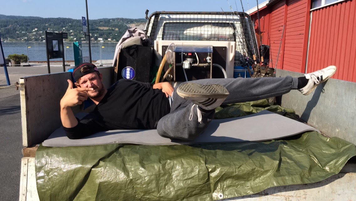 Nattens vading var siste innspurt og nå hadde vi tre timer før festivalen startet og alt skulle være på plass. En kjøleboks med fangsten ble godt forsegla og teipa igjen for å unngå søl i bilen. Sindre og Frank trengte virkelig en time på øyet, så Adam og jeg dro rett inn til Oslo med tre rensepumper for å få bukt med det grumsete vannet i akvariene. Søvnmangelen hadde slått til hos Daniel og Vetle som hadde brukt mesteparten av natten på å sove i bilen, men da startskuddet gikk var alle på plass og stemningen god.
