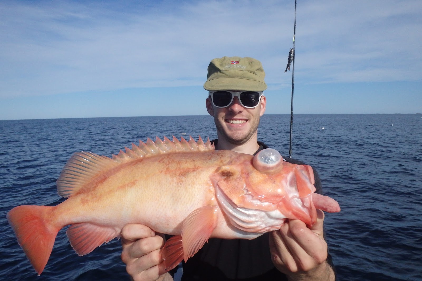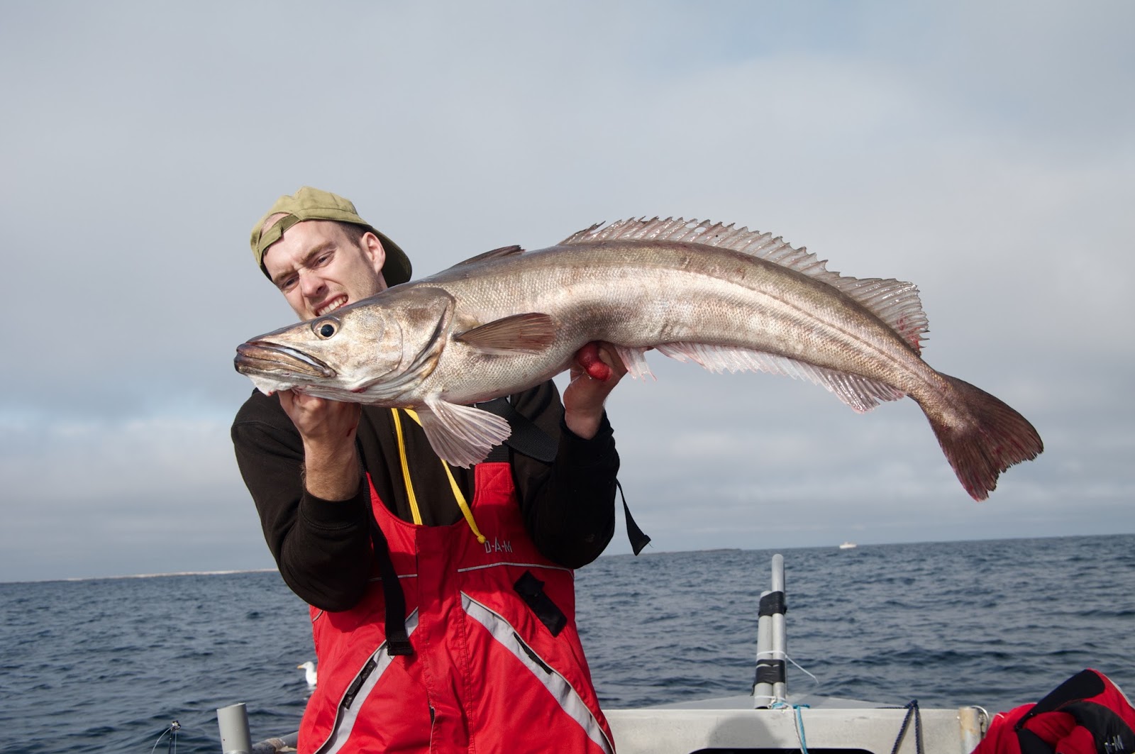Når vi endelig kommer oss ut er det første målet for båten min, bestående av sukkertøymannen og Sindre, å plukke uer på en plass de fant dagen før. Vi tøffer utover og vel fremme finner vi også Adrian og Irvin der. Både Adrian og jeg mangler arten, og det går ikke lang tid før vi hører et jubelrop fra Adrian. Da var det bare meg igjen. Det går som det pleier å gå når alle unntatt èn har arten. Adam og Sindre drar jevnt uer ombord, Sindre drar endog en dobbel, mens jeg fisker smålanger til en liten bronsemedalje. Til slutt har jeg egentlig gitt helt opp og er mer eller mindre klar til å dra for å fiske spiss, for jeg har på nok en liten lange. Typisk langefight hele veien opp. Det er derfor med rimelig stor ekstase jeg plutselig ser at fisken som kommer til overflaten slett ikke er lang, og slett ikke stygg! Den er fiiiin, den er rød! Svipp, svupp, rett oppi båten – 1550 gram med deilig uer og jeg kan krysse av et dagsmål.