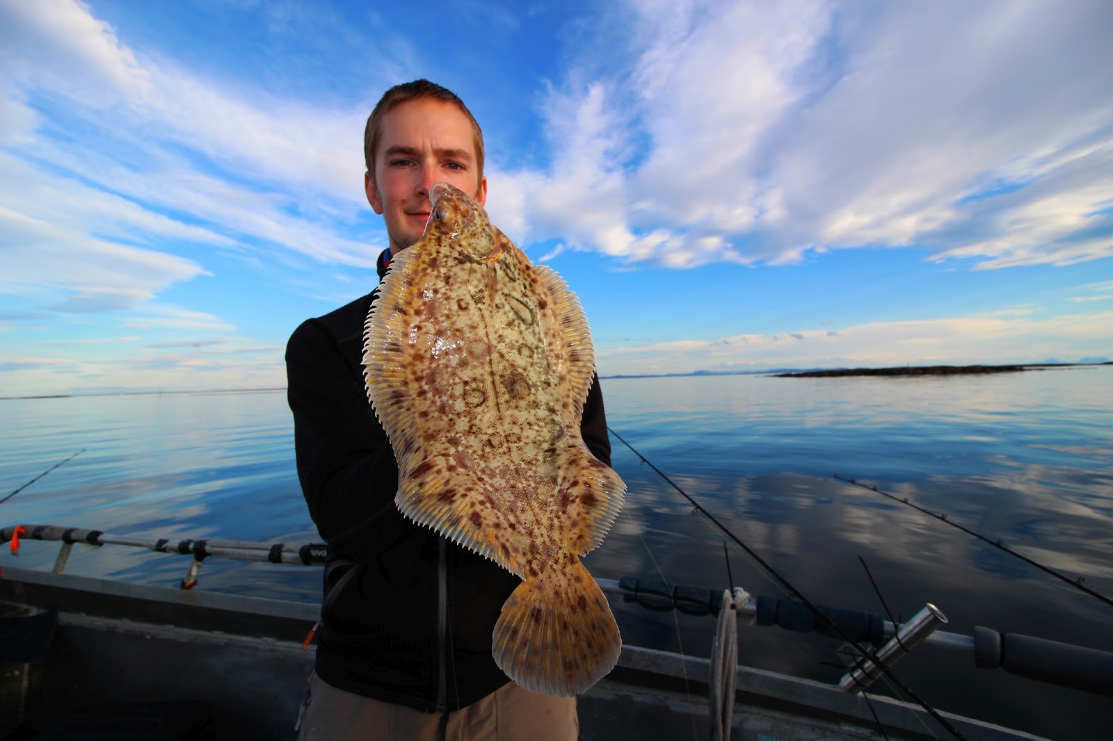 Målrettet fiske etter breiflabb er jo generelt bare piss, men det er jo det vi liker. Tidligere hadde vi hørt om en plass der det visstnok var tatt to breiflabb dagen i forveien, så vi måtte jo prøve i alle fall. Vi rigget opp med pilker og hadde vind som sveipet oss effektivt over området. Det tok ca ti minutter før Calle har noe på. Tung, og lite liv. Vi andre stopper opp og ser nesten med mistro på den døde vekten han drar opp. Vi klarer jo ikke helt å tro at det kan være flabb, for det går jo egentlig ikke an å få, men det ser jo så lovende ut?? Og jammen, med ett, opp av mørket kommer plutselig en søt liten breiflabb. Kroken satt ikke akkurat planta i kjeften, men uansett: Sykt!