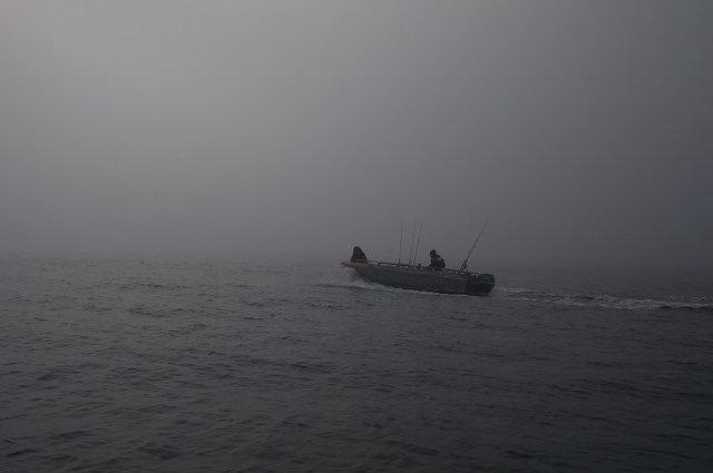 Første ordentlige fiskedag begynte med å besøke det åpne, og for meg fryktinngytende, storhavet. Heldig nok var bølgene svært overkommelige, knapt en meter høye lange dønninger. I bytte hadde vi fått en tåke som kunne mettet vesentlige deler av de ubebodde områdene i Sibir.